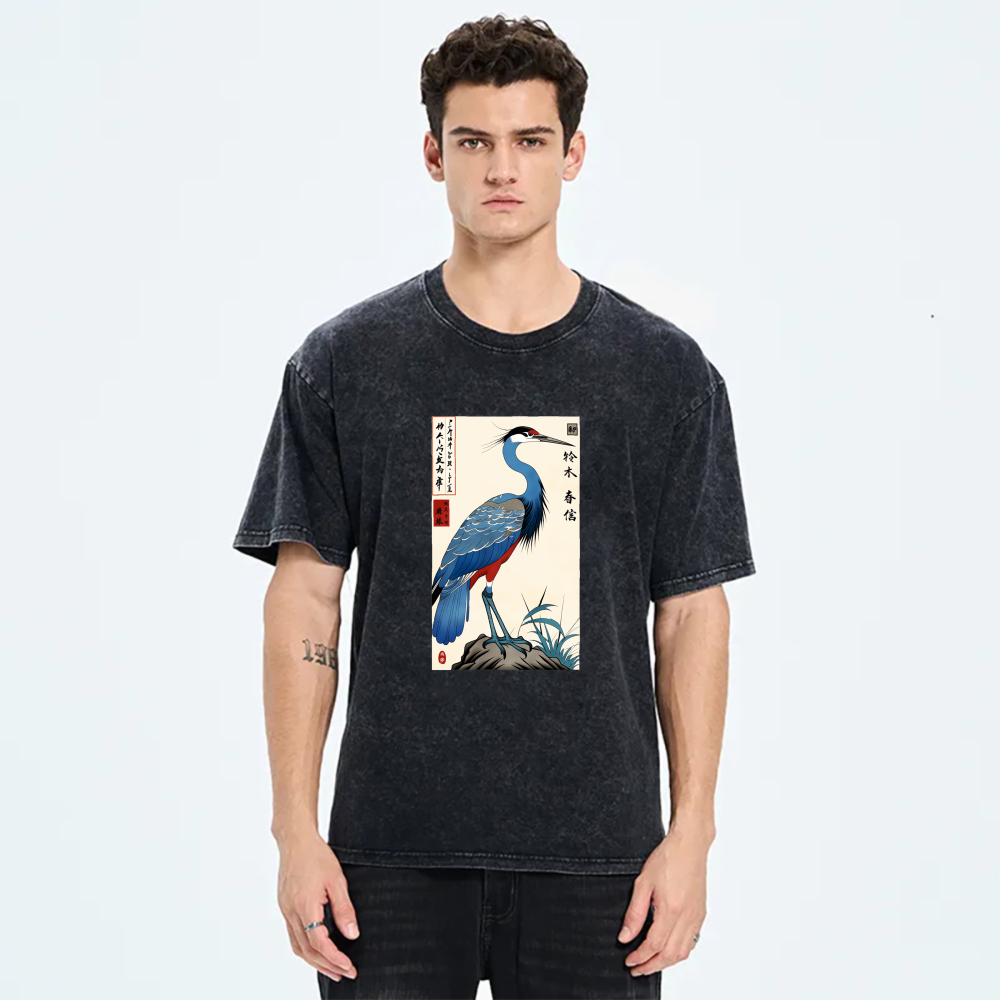 Blue Heron Standing On Rock With Calligraphy tshirt 100% cotton