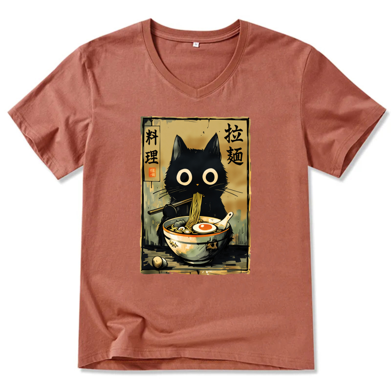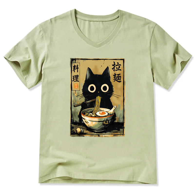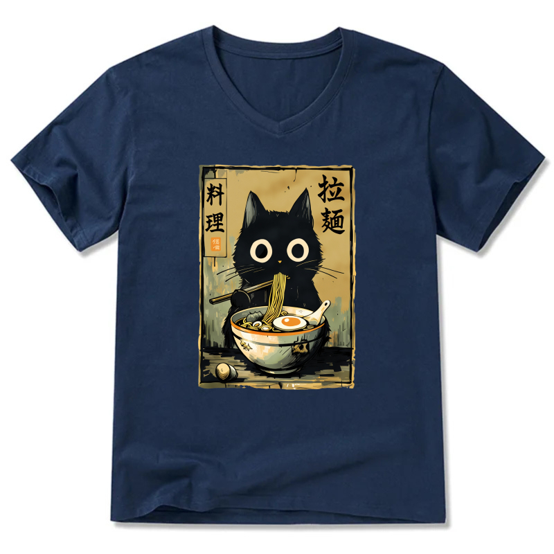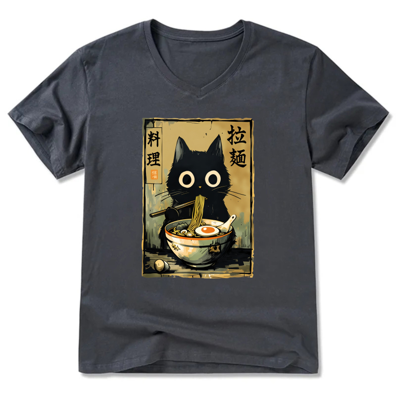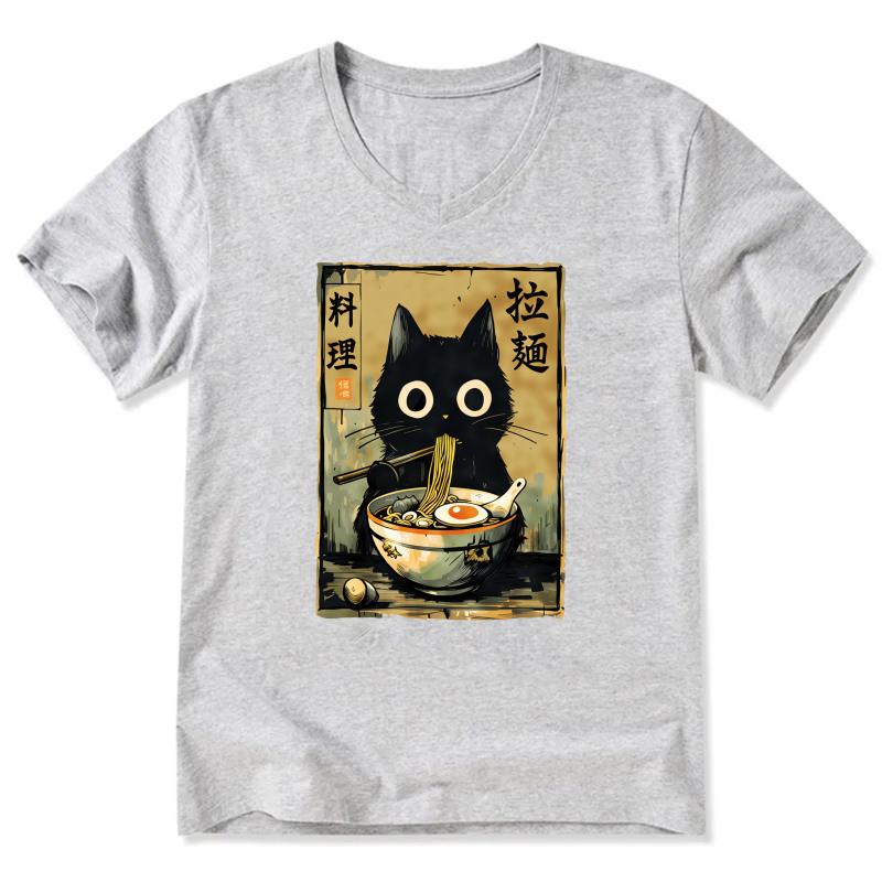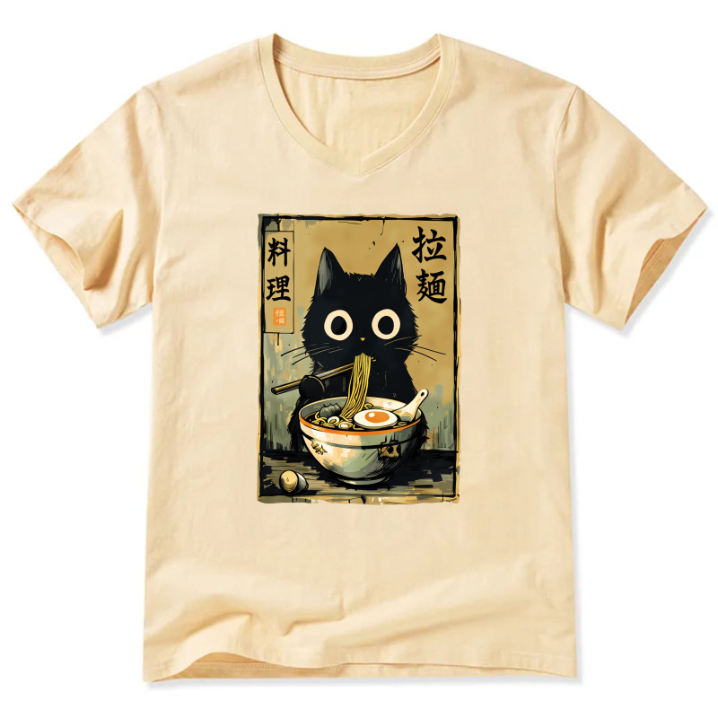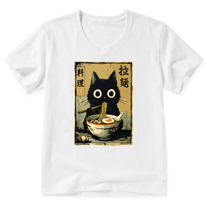 Black Cat Ramen Noodle Art T-Shirt Japanese Food Design Unisex Casual Shirt