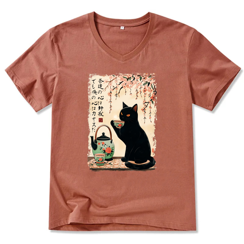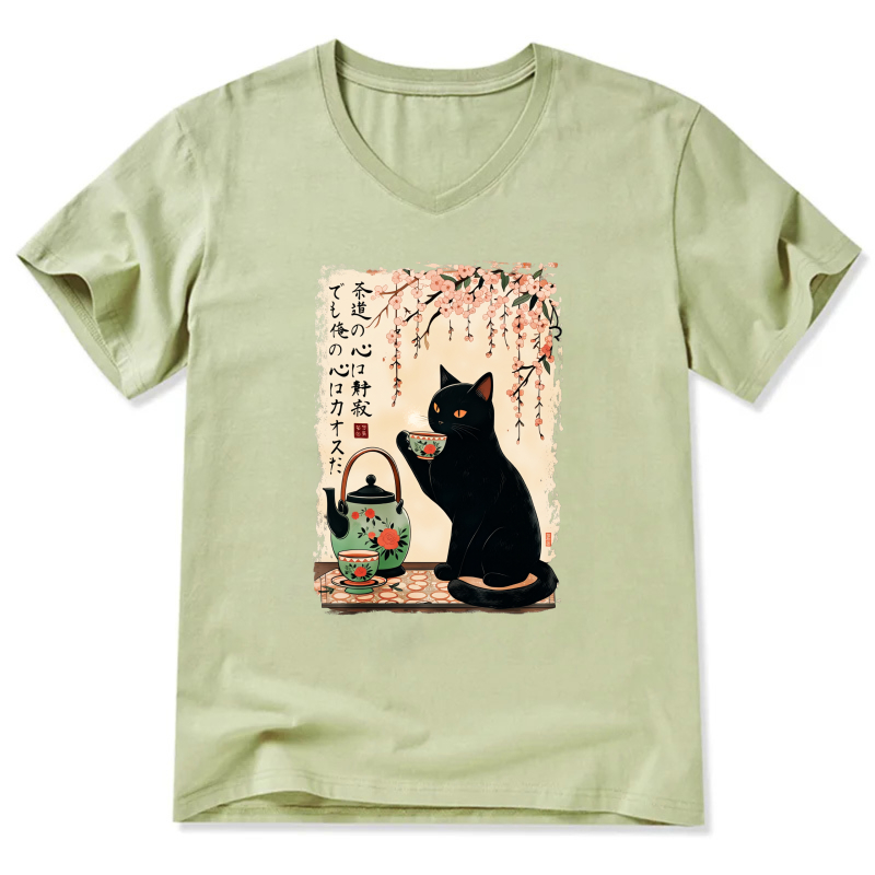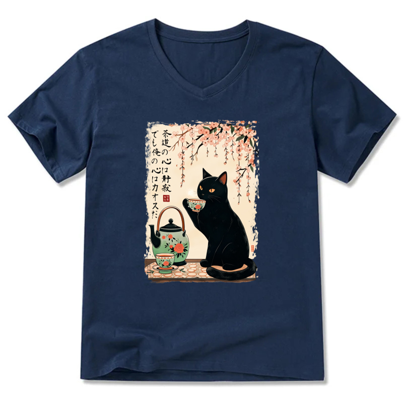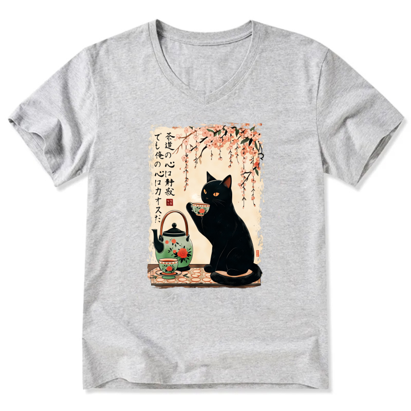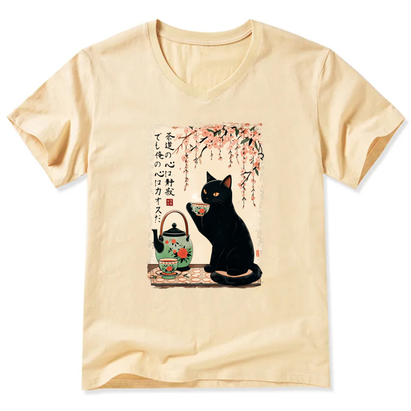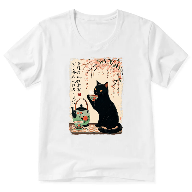 Black Cat Tea Ceremony Japanese Art T-Shirt With Cherry Blossom Design