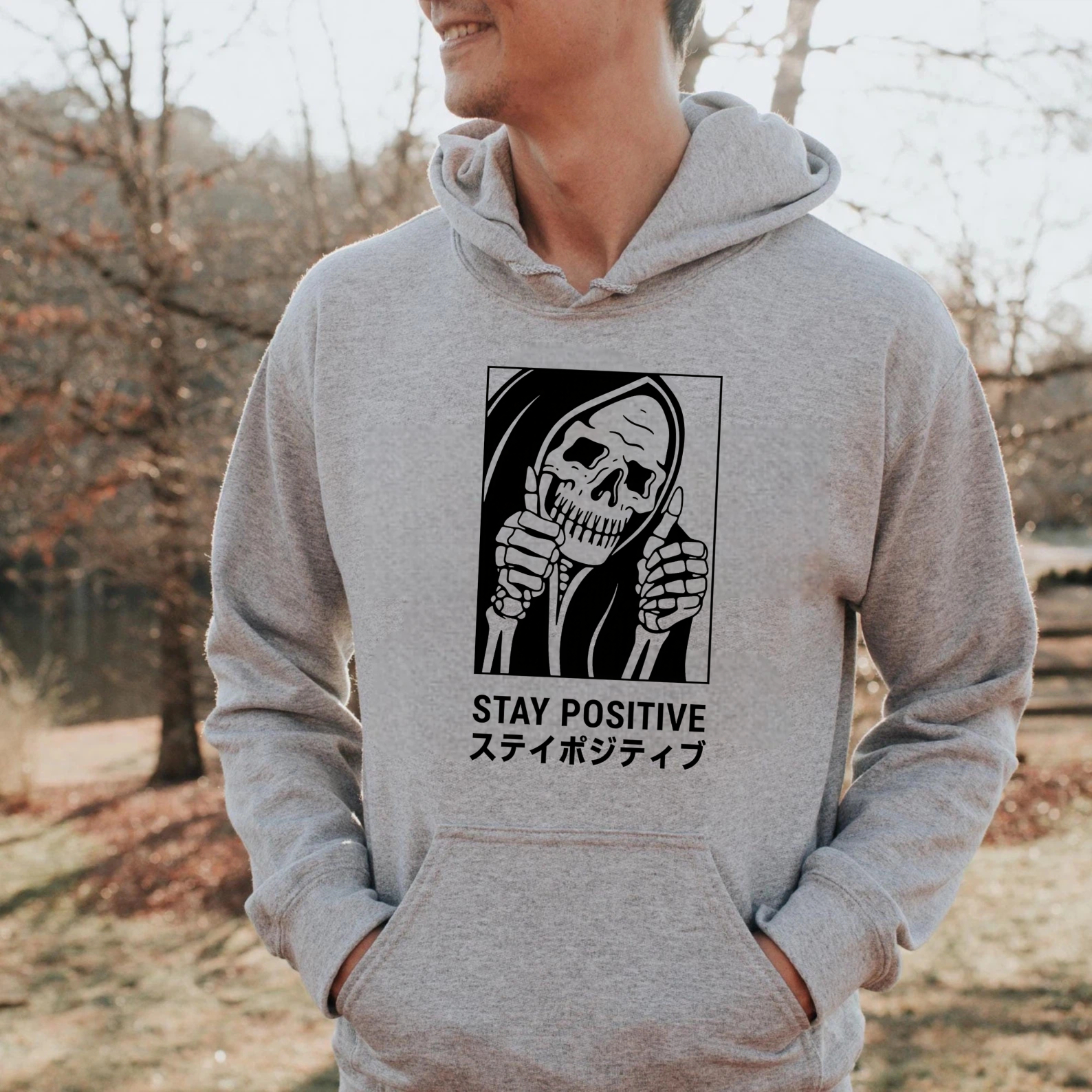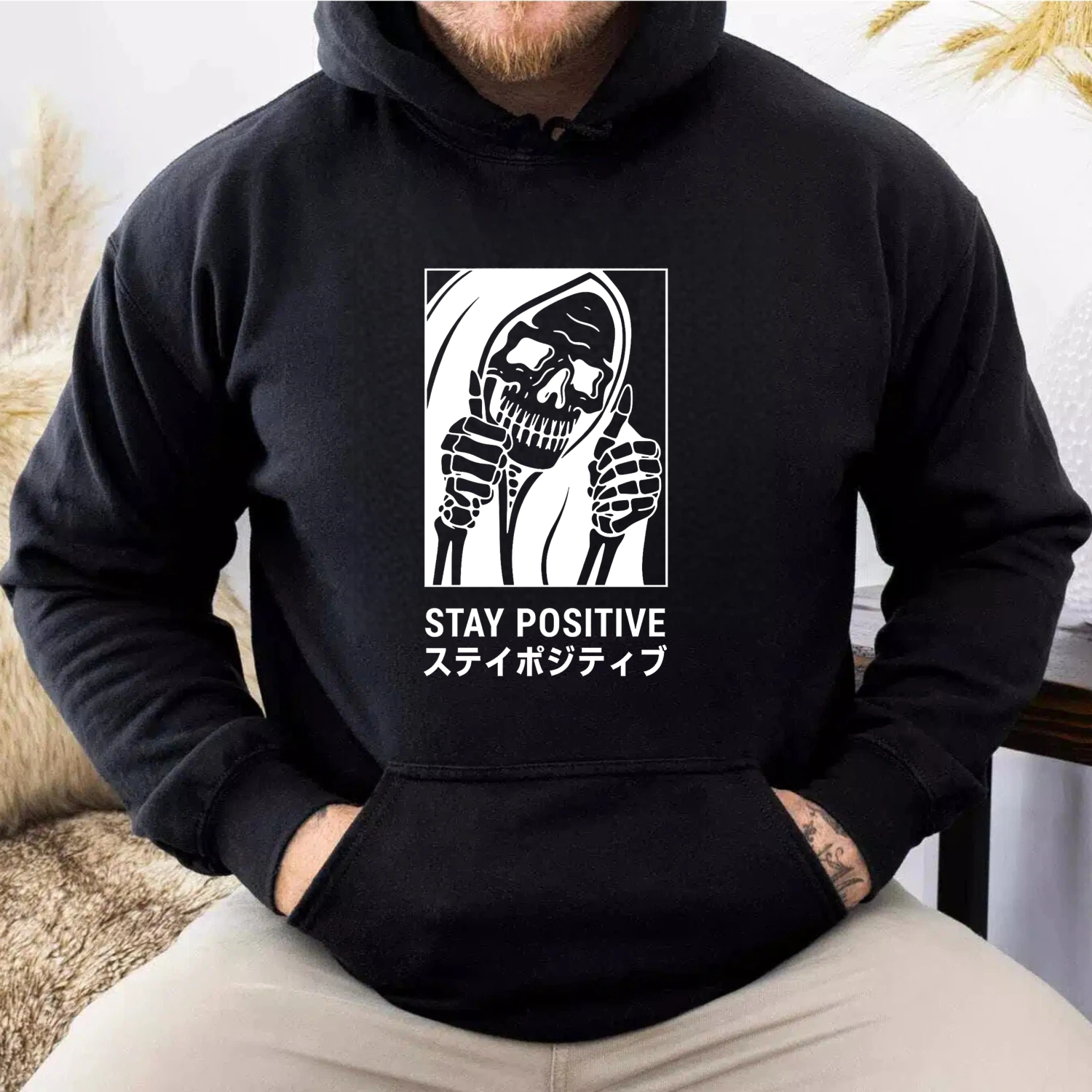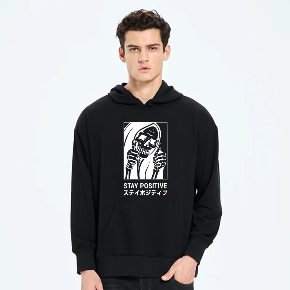Black Hoodie With Grim Reaper Design Stay Positive Text And Japanese Characters Graphic Sweatshirt
