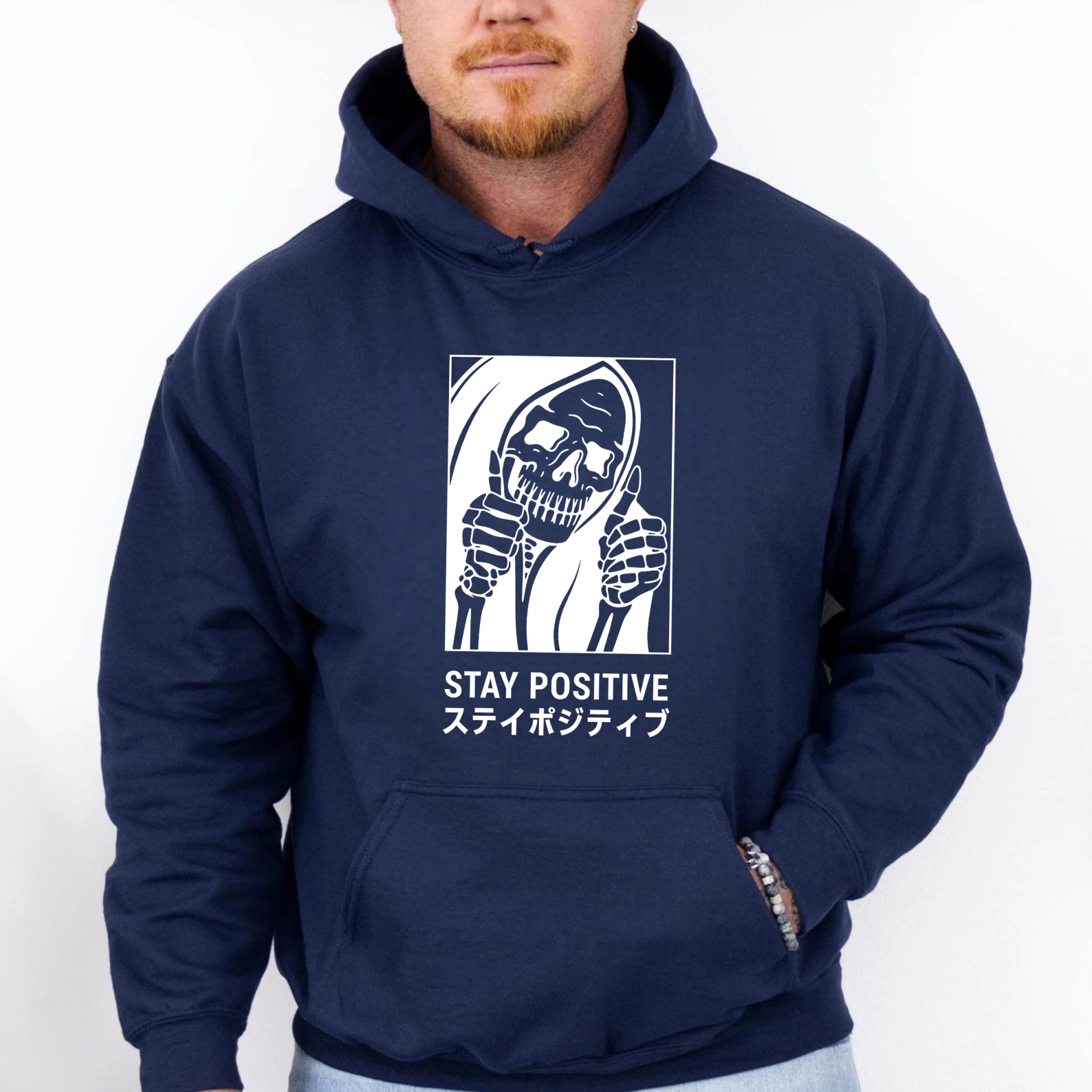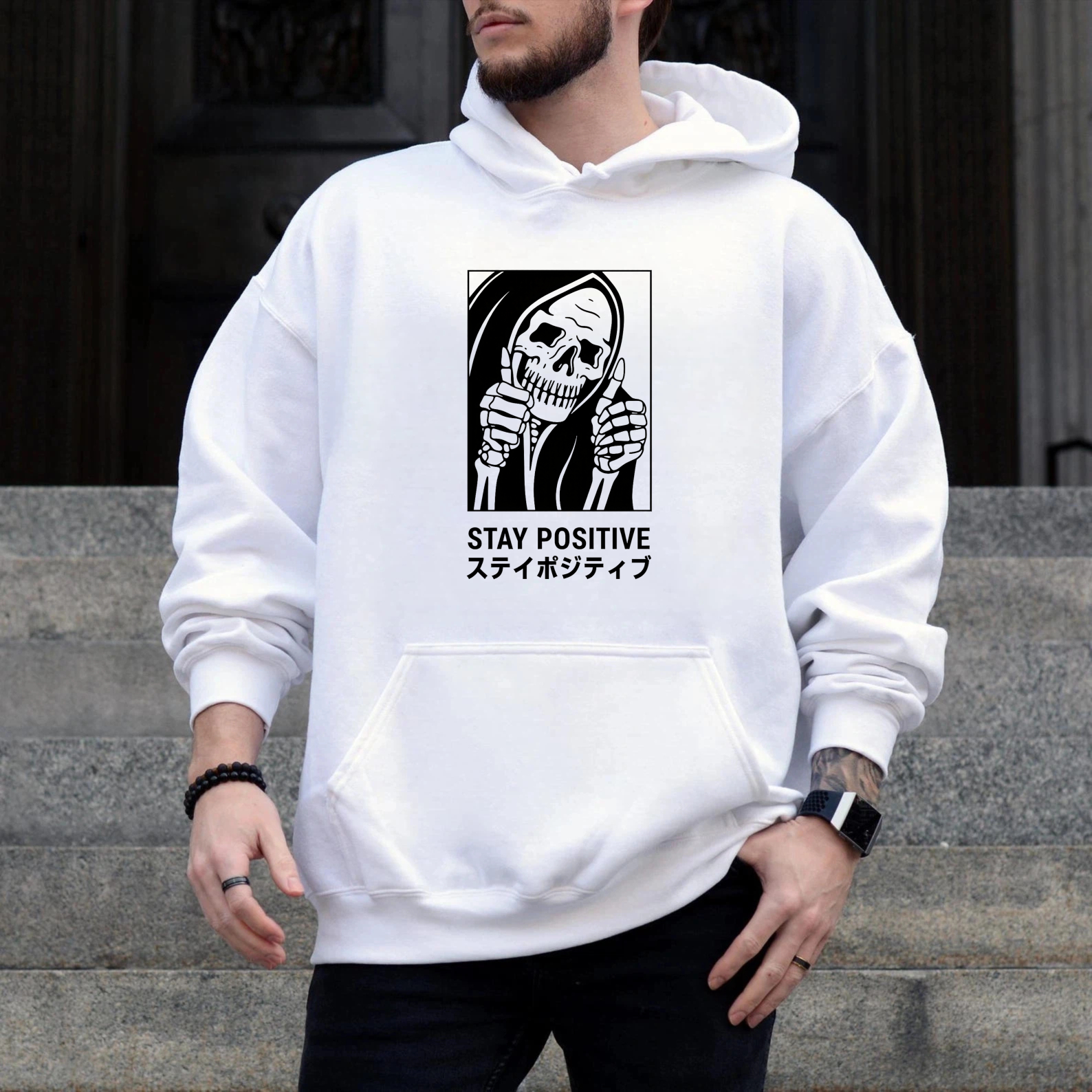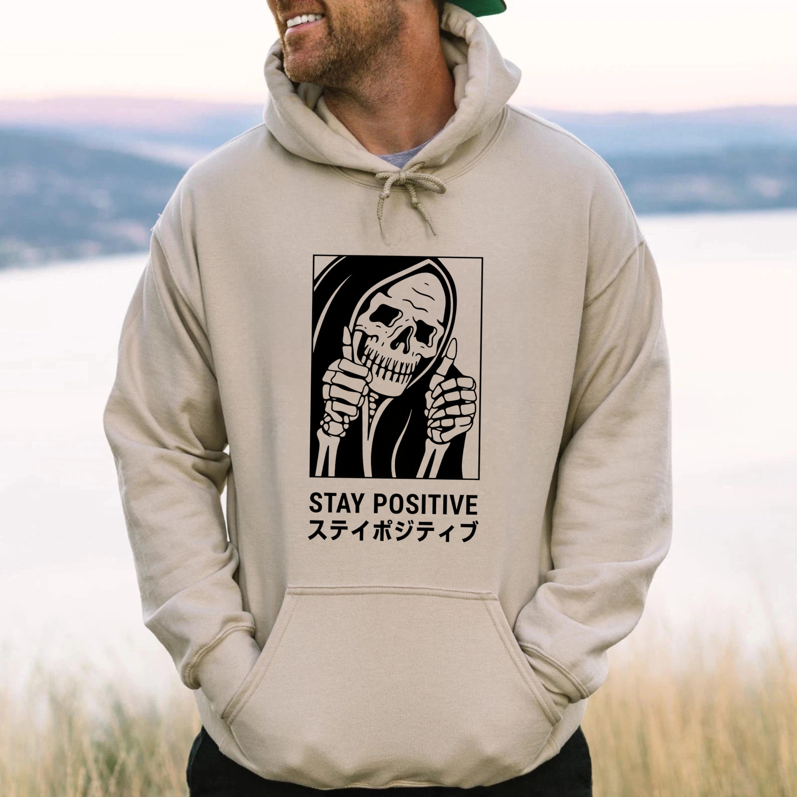 Black Hoodie With Grim Reaper Design Stay Positive Text And Japanese Characters Graphic Sweatshirt