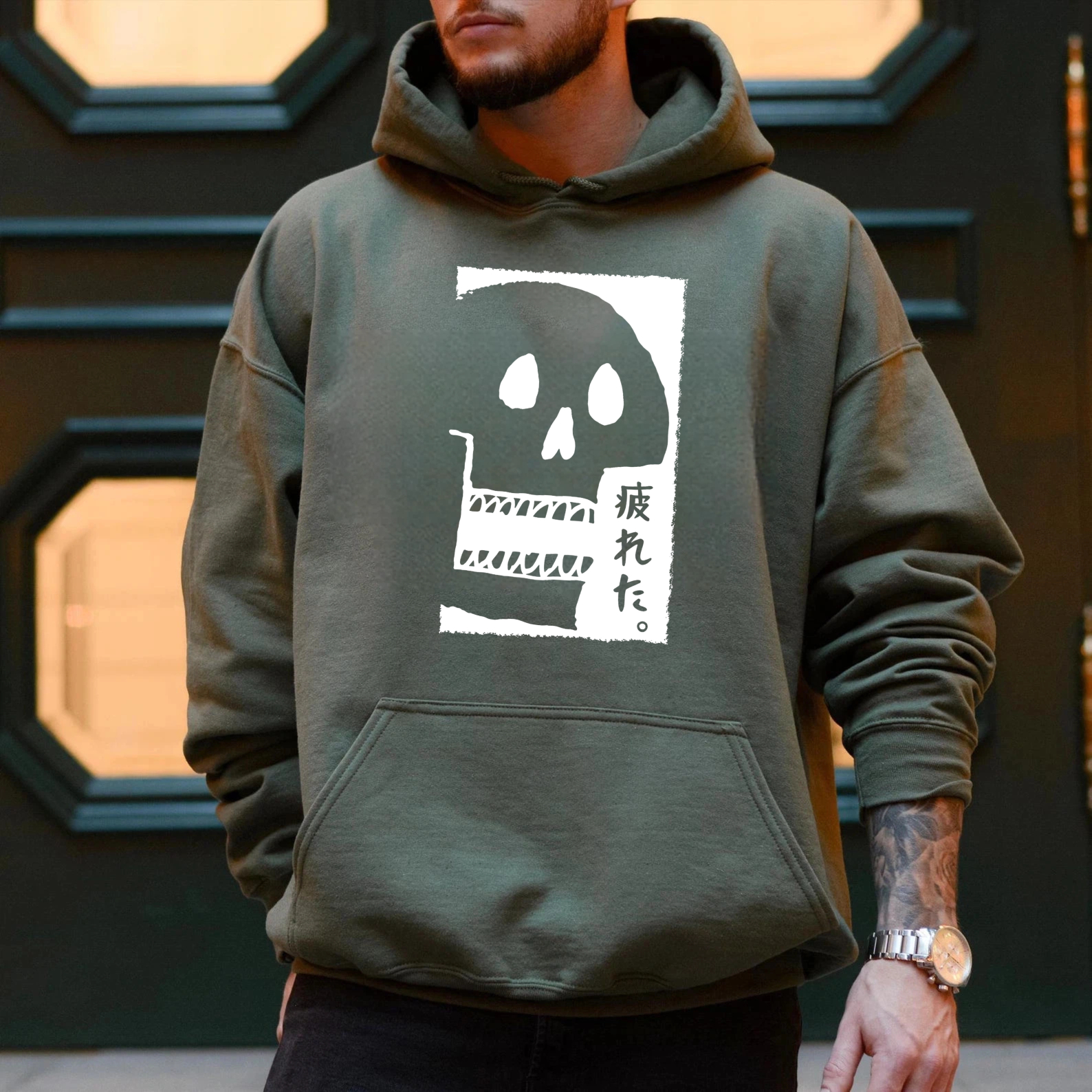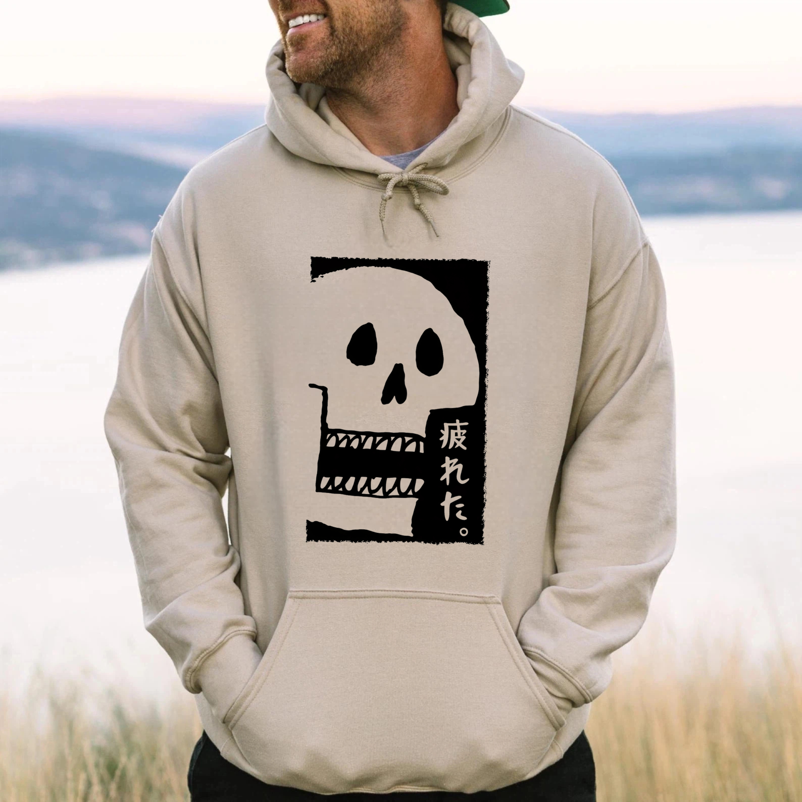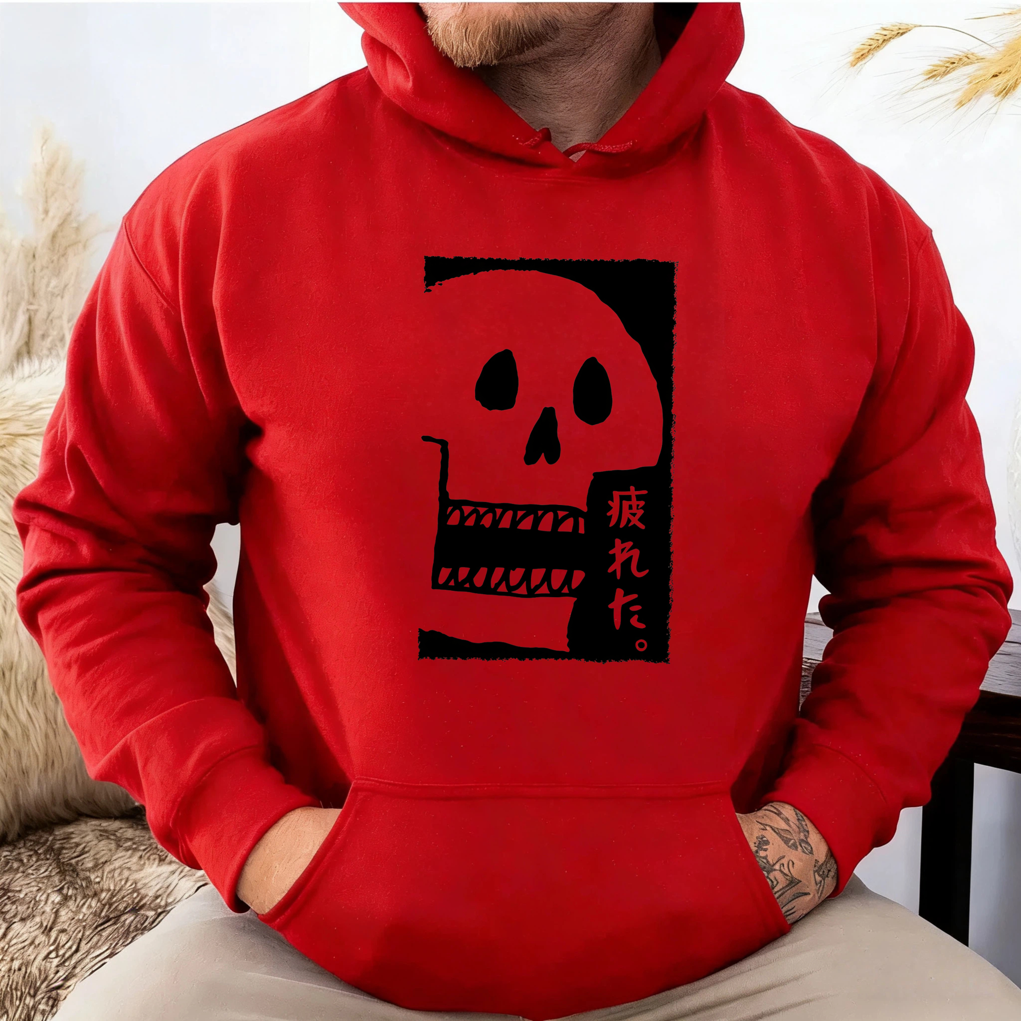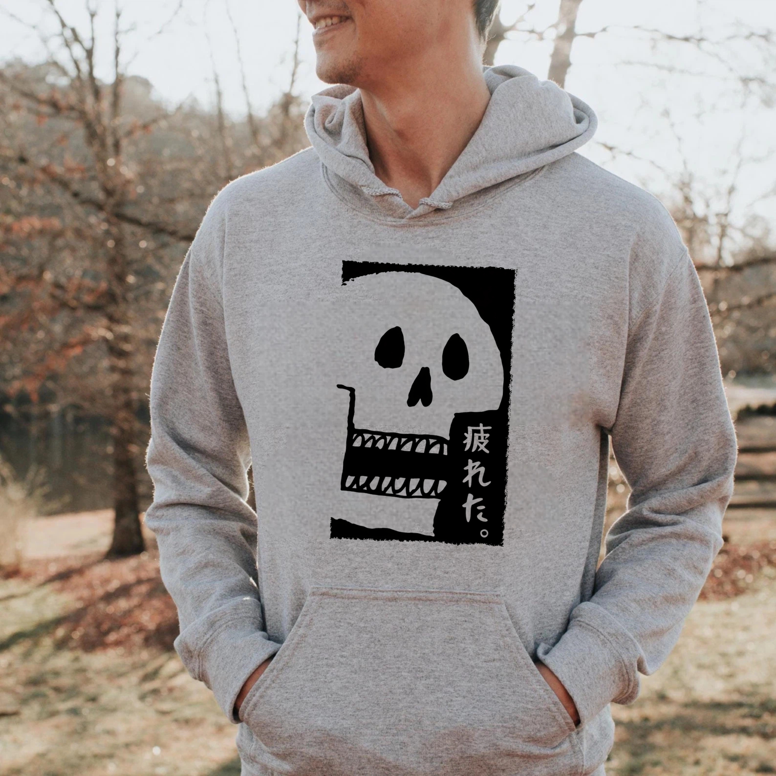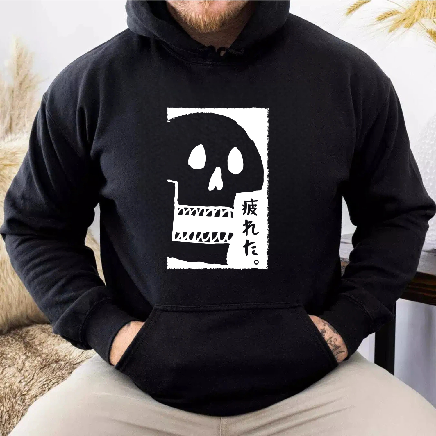 Black Hoodie With Skull And Japanese Text Design Unisex Sweatshirt Casual Streetwear