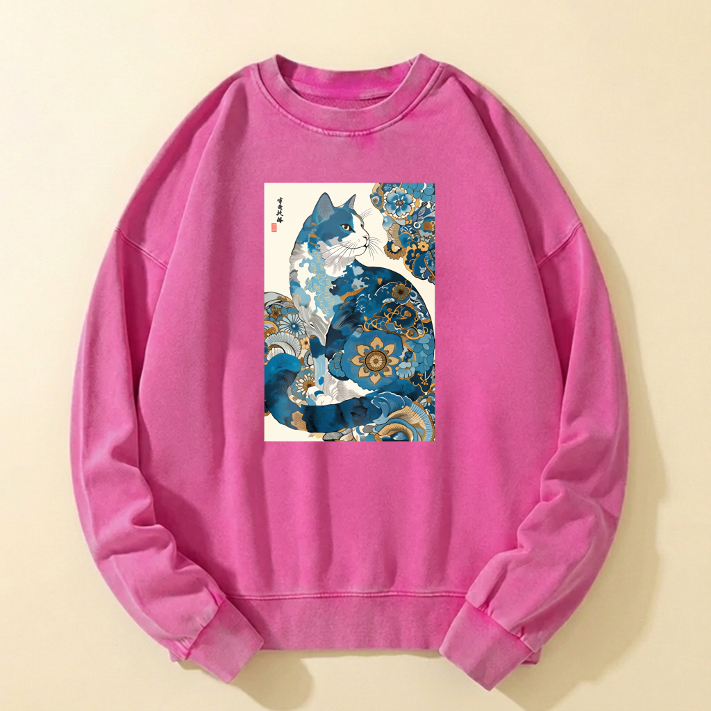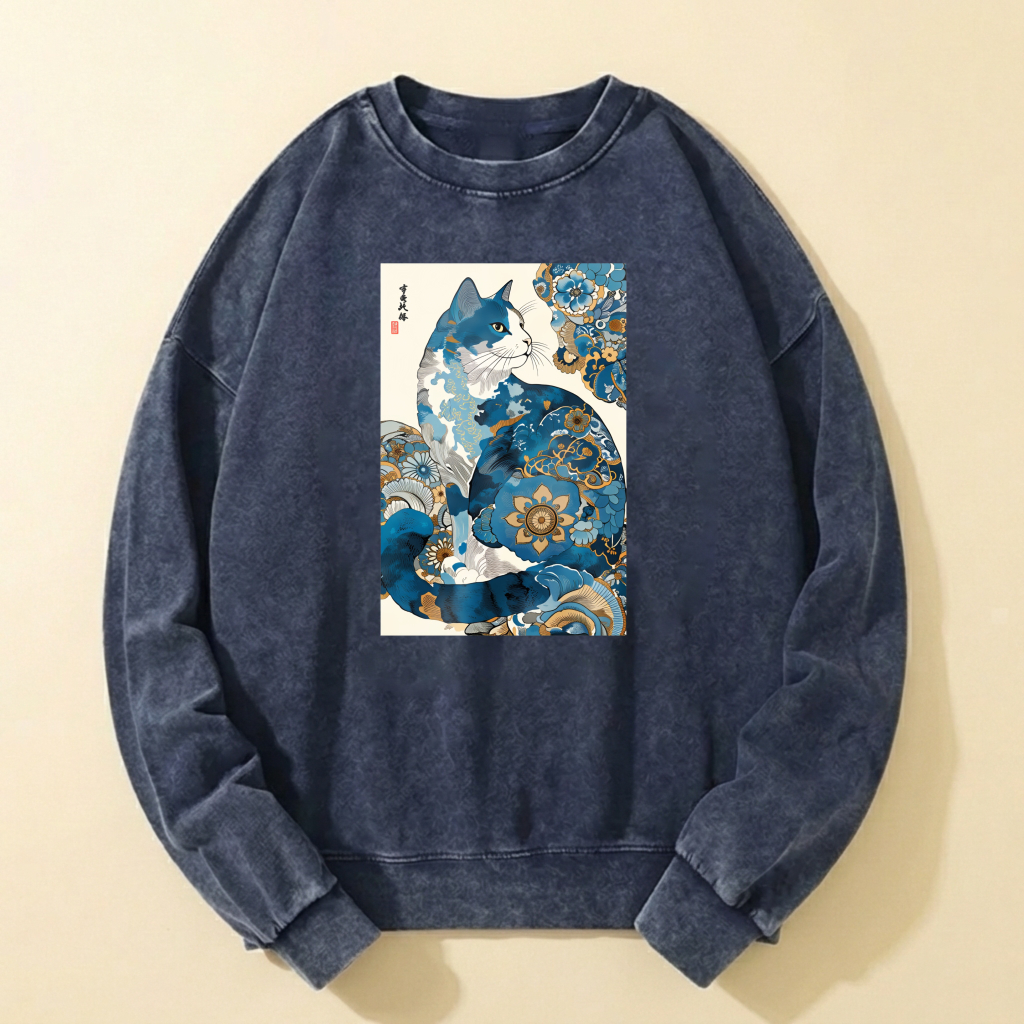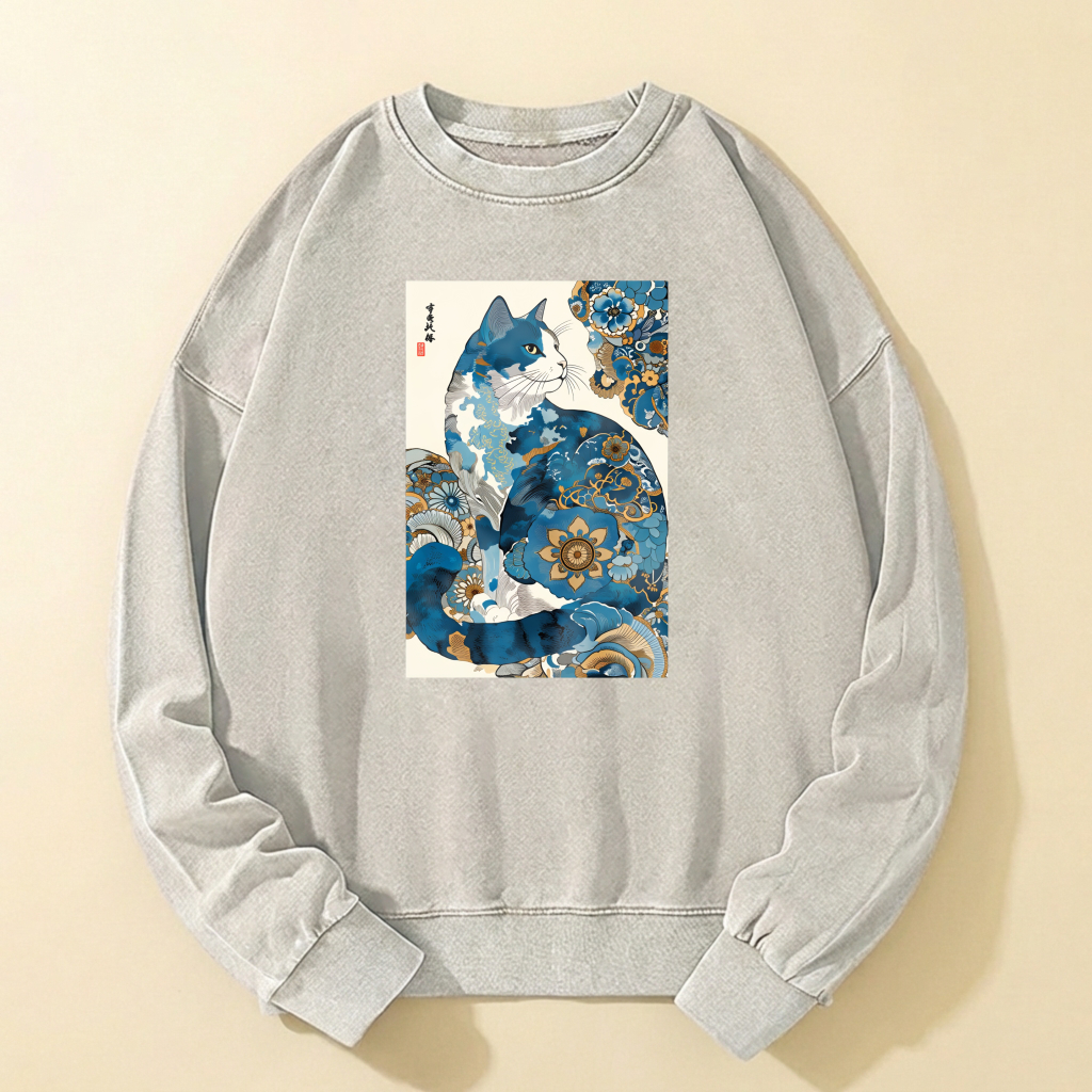 Blue Cat Art Print Crewneck Sweatshirt Unisex Casual Long Sleeve Pullover Fashion Top