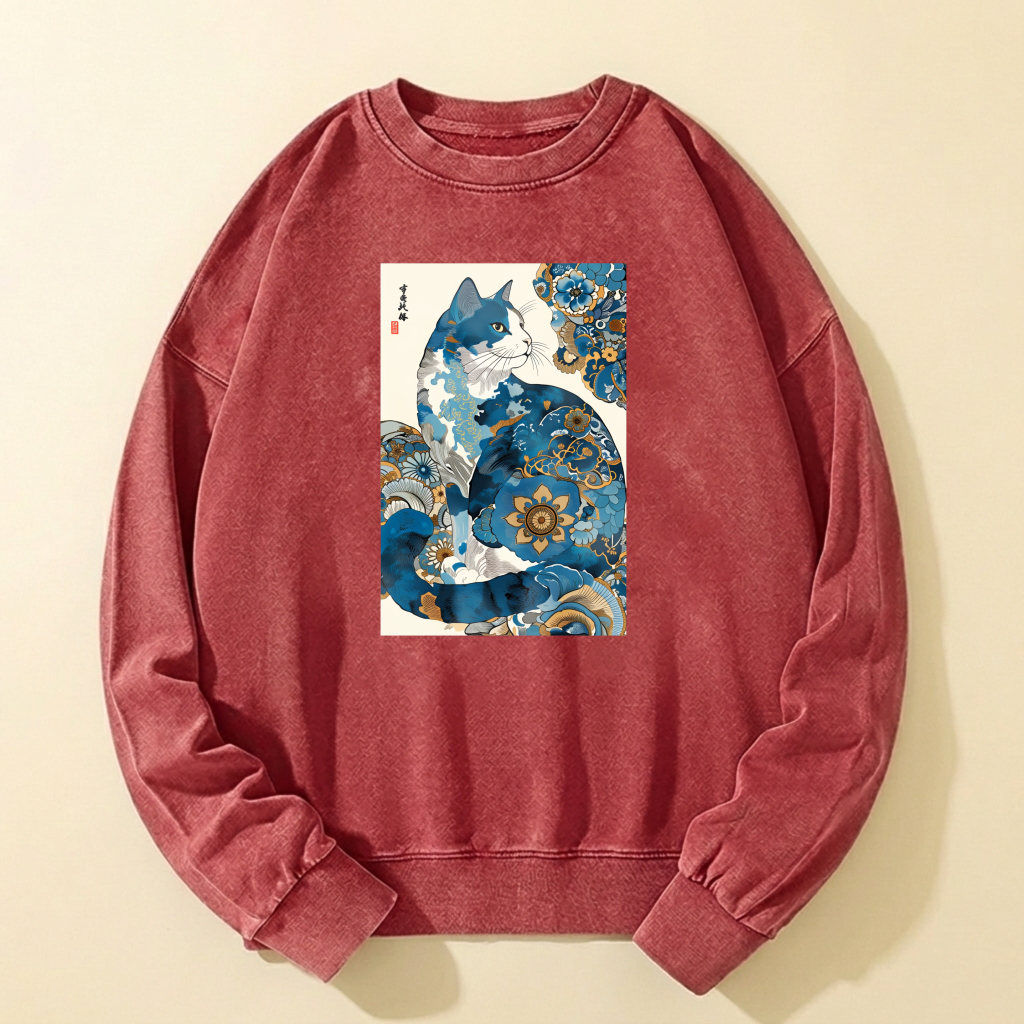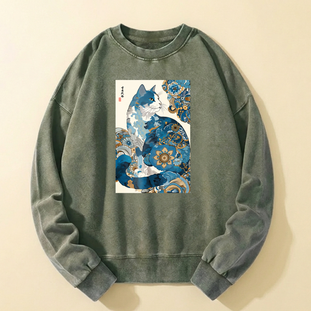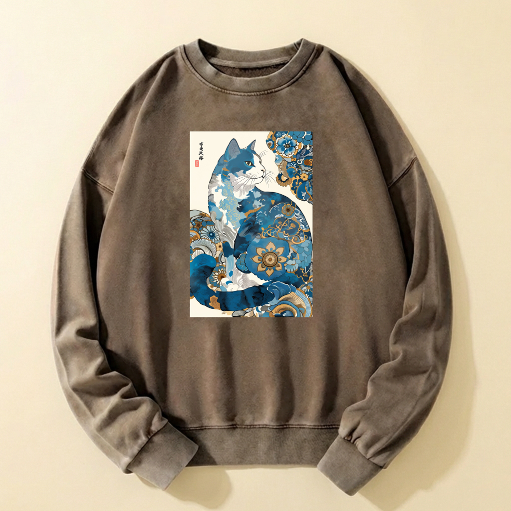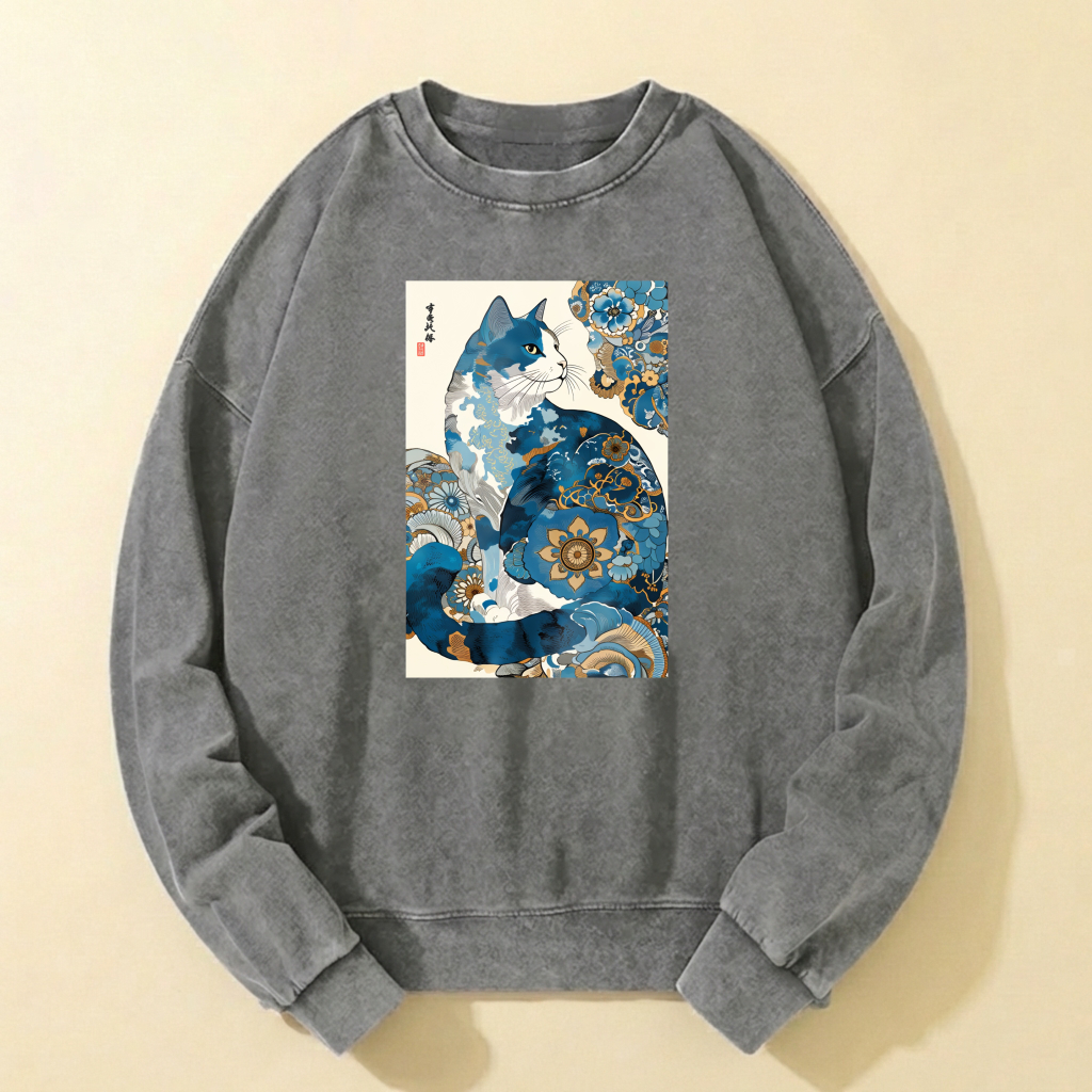 Blue Cat Art Print Crewneck Sweatshirt Unisex Casual Long Sleeve Pullover Fashion Top
