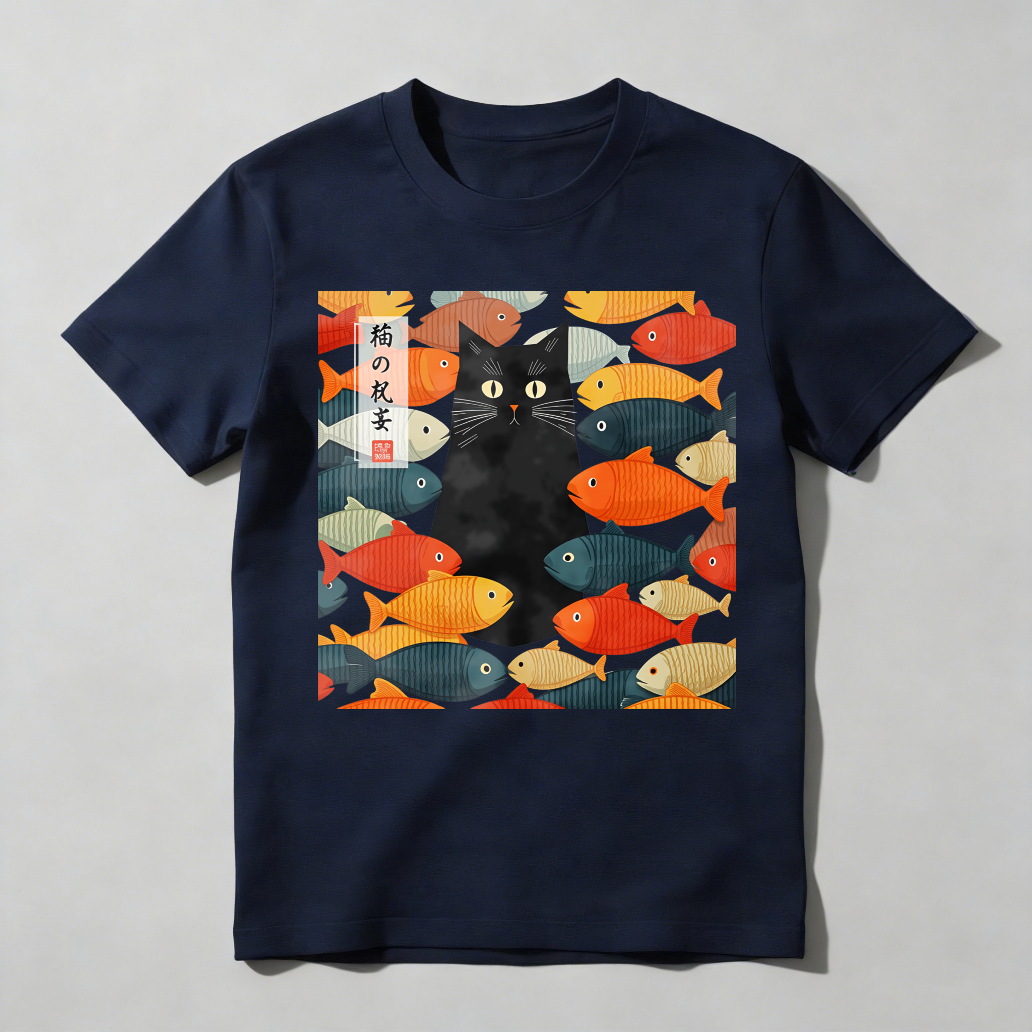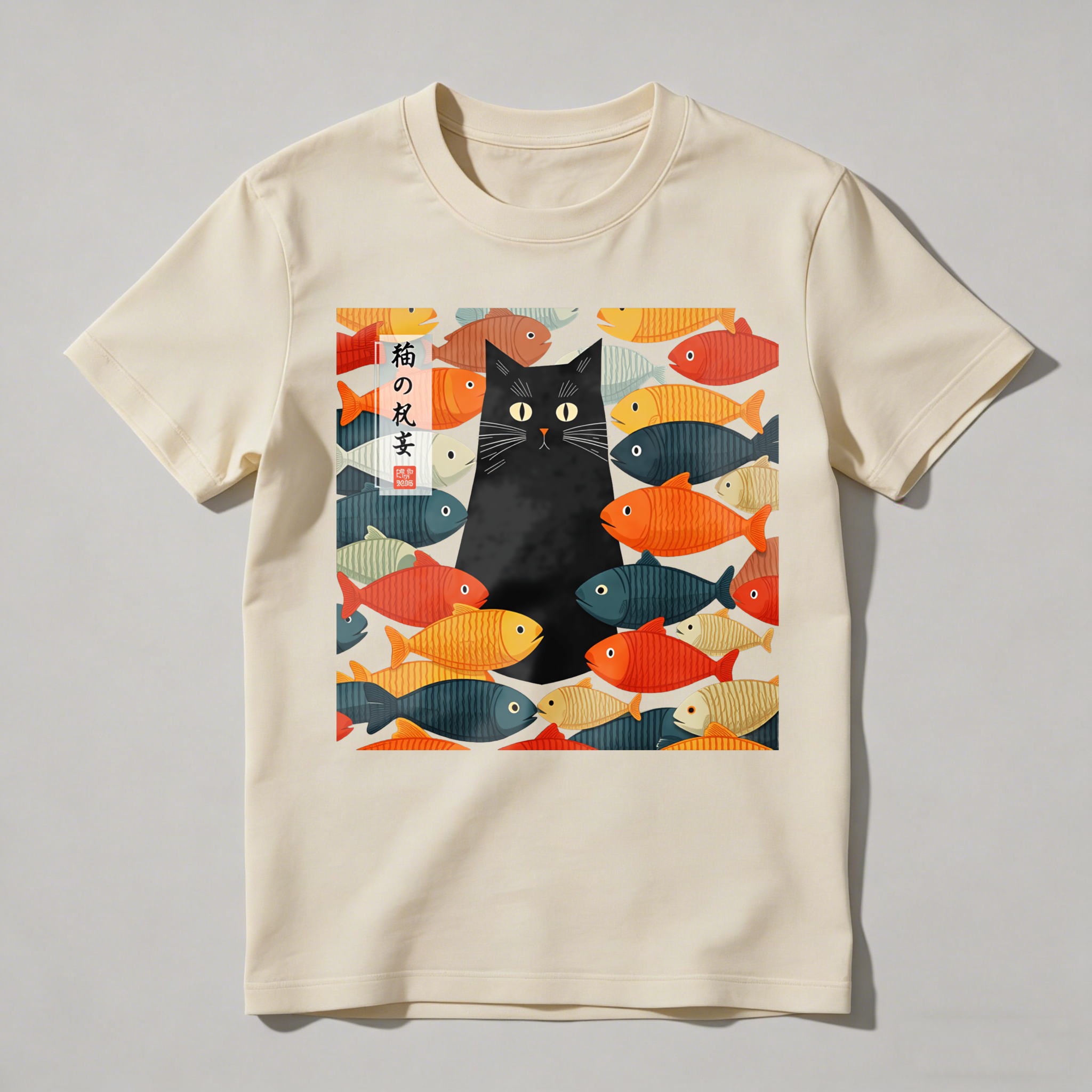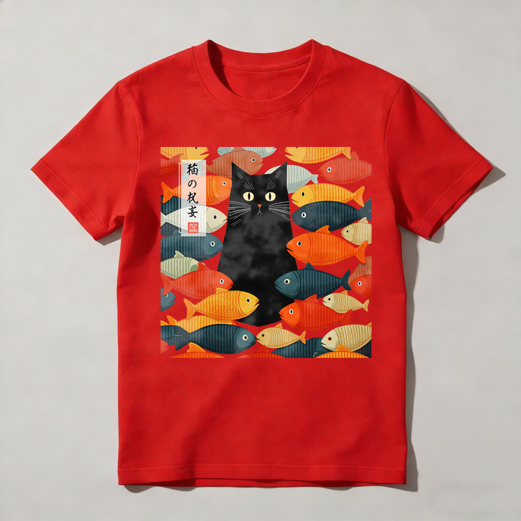Cat And Colorful Fish Pattern tshirt 100% cotton