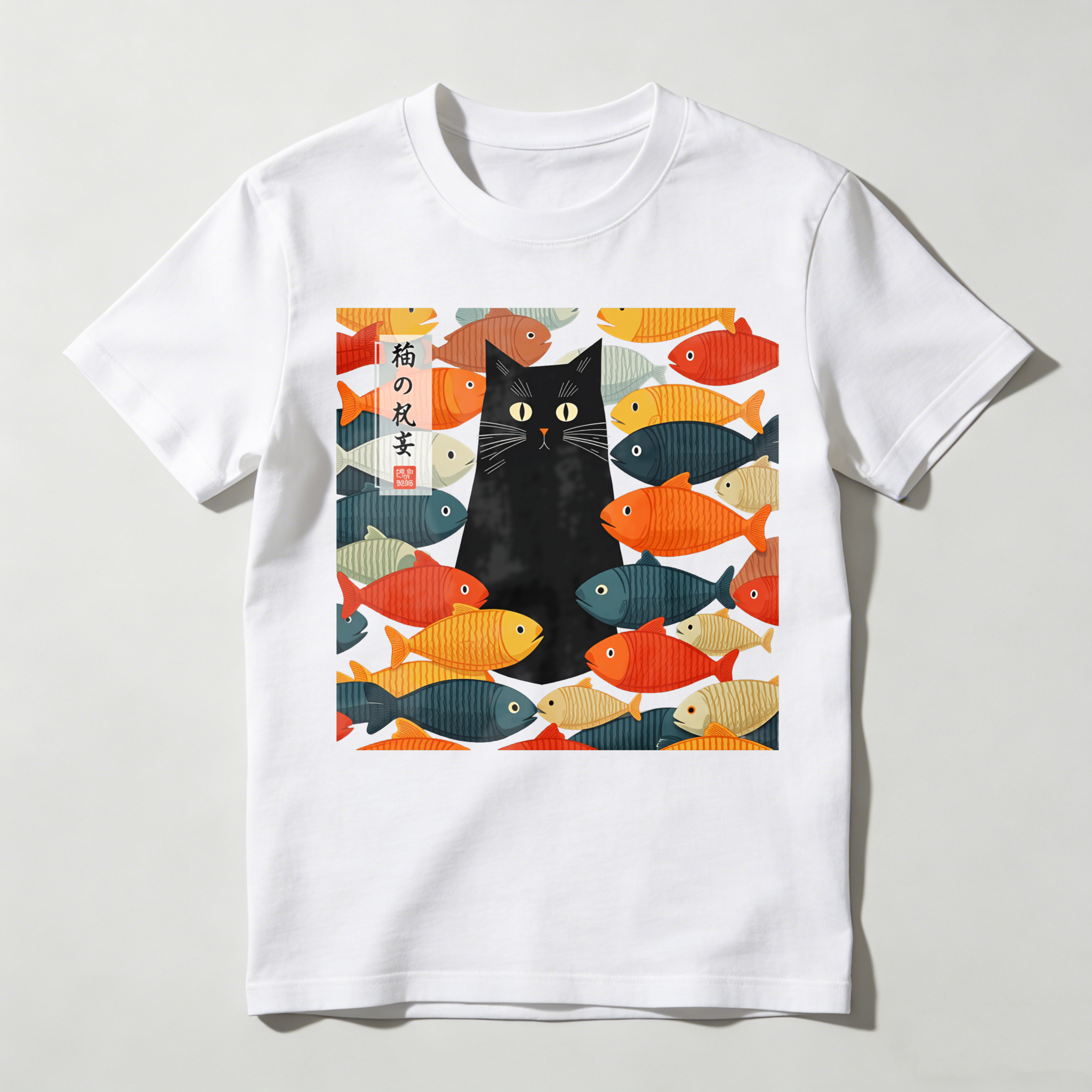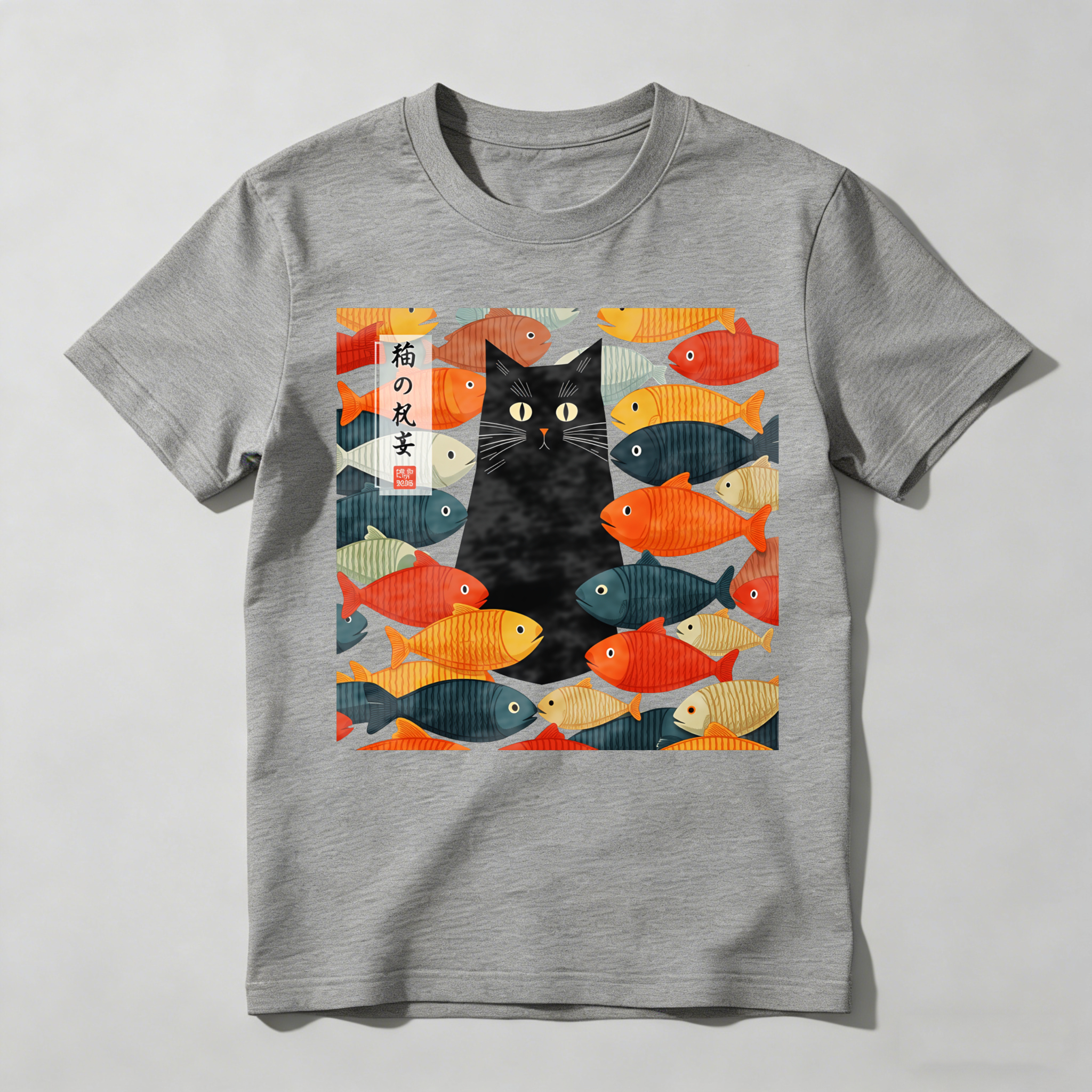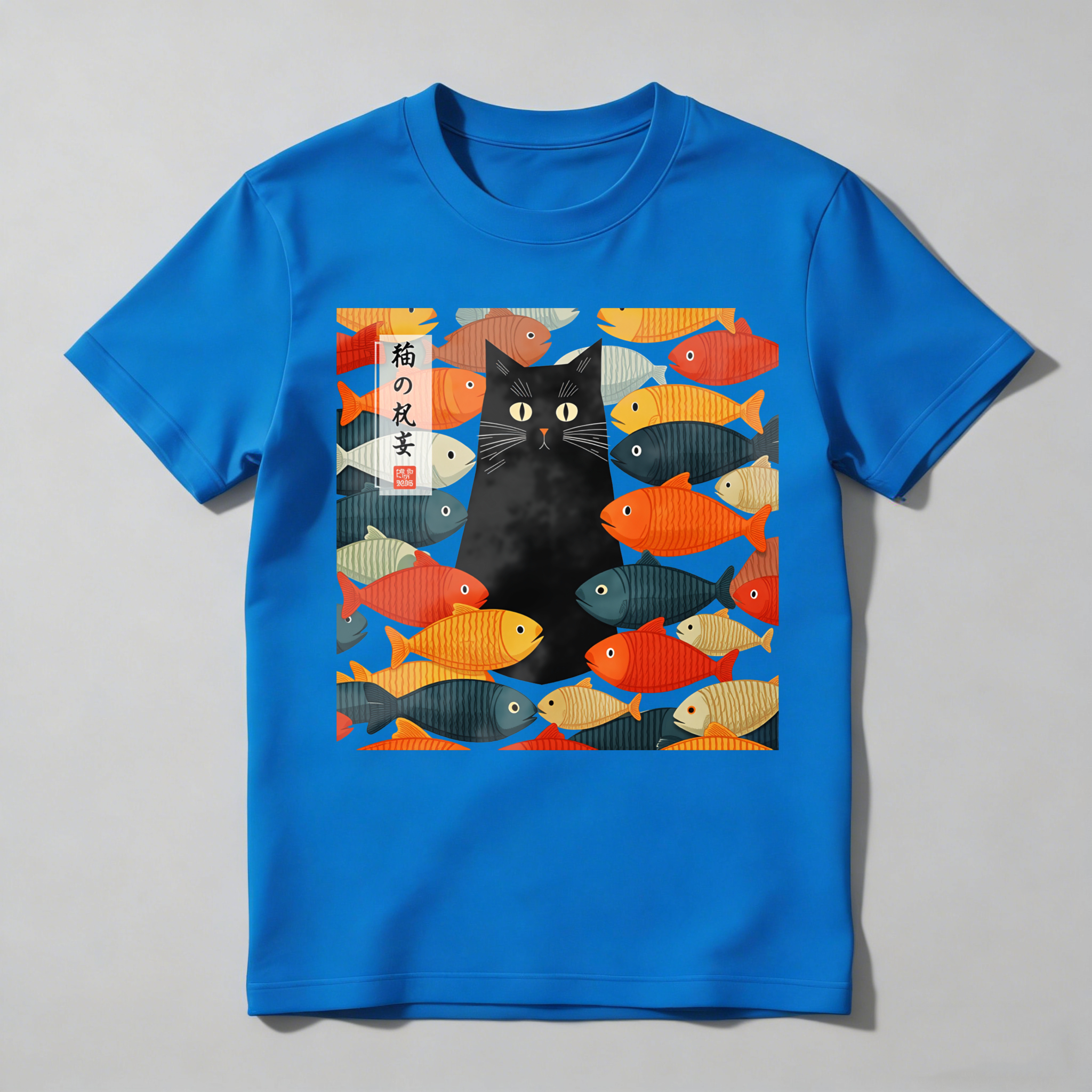 Cat And Colorful Fish Pattern tshirt 100% cotton
