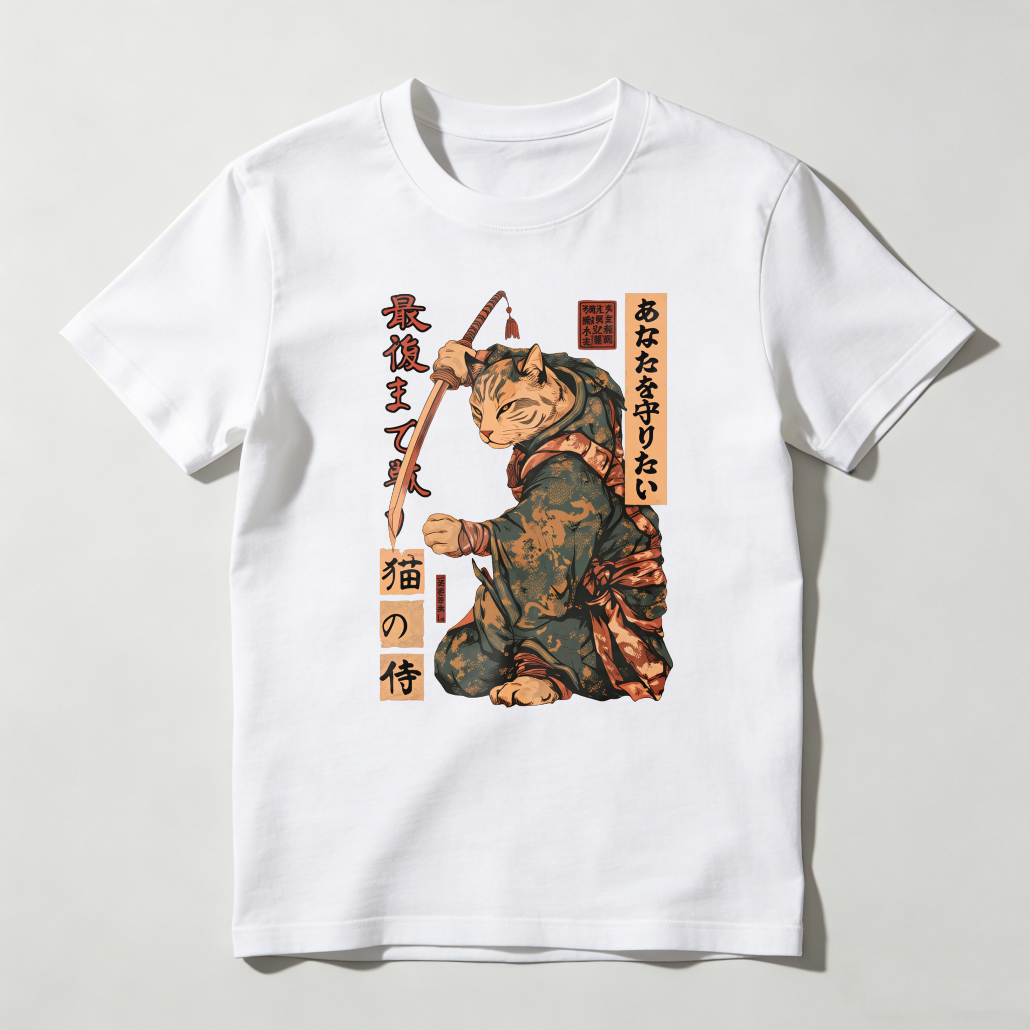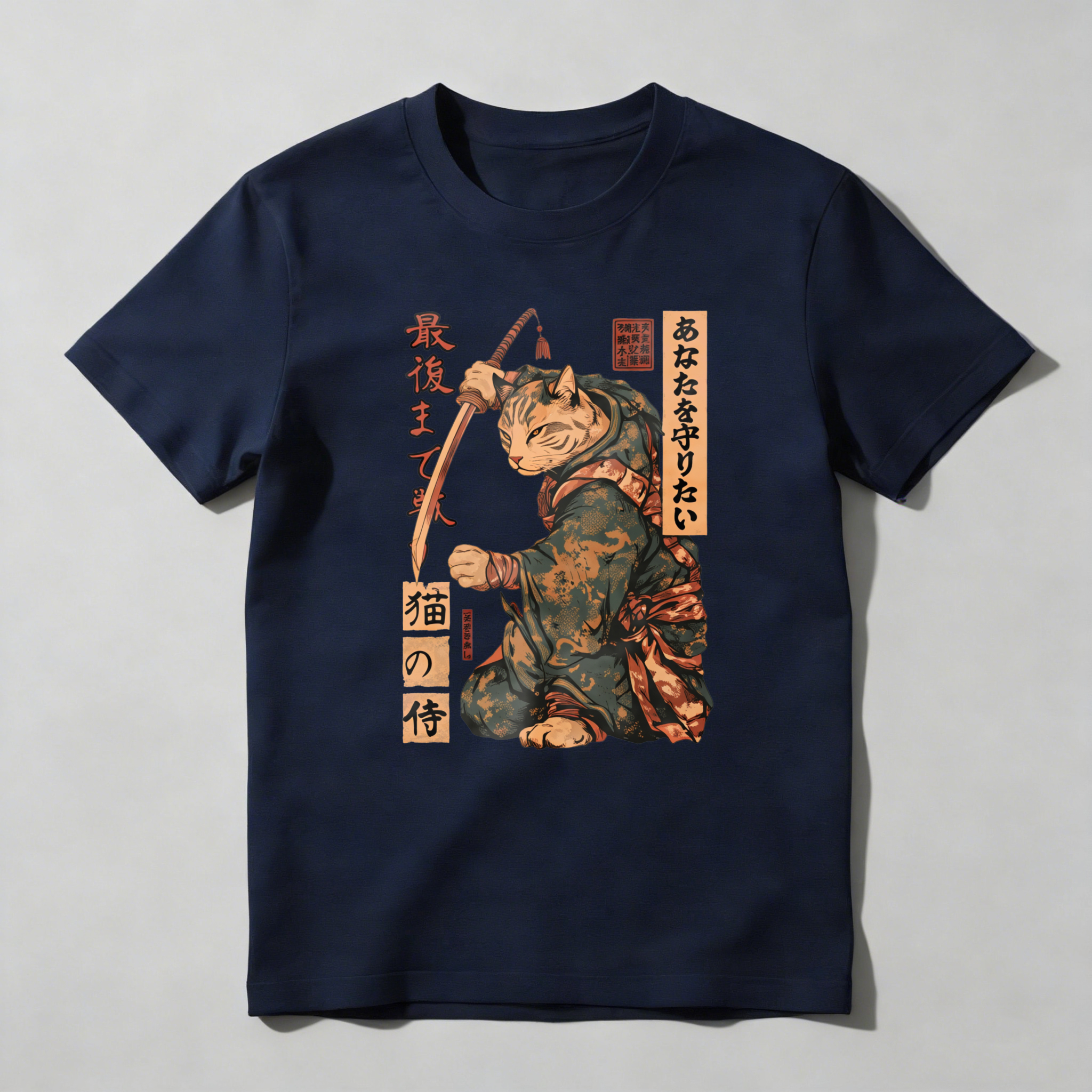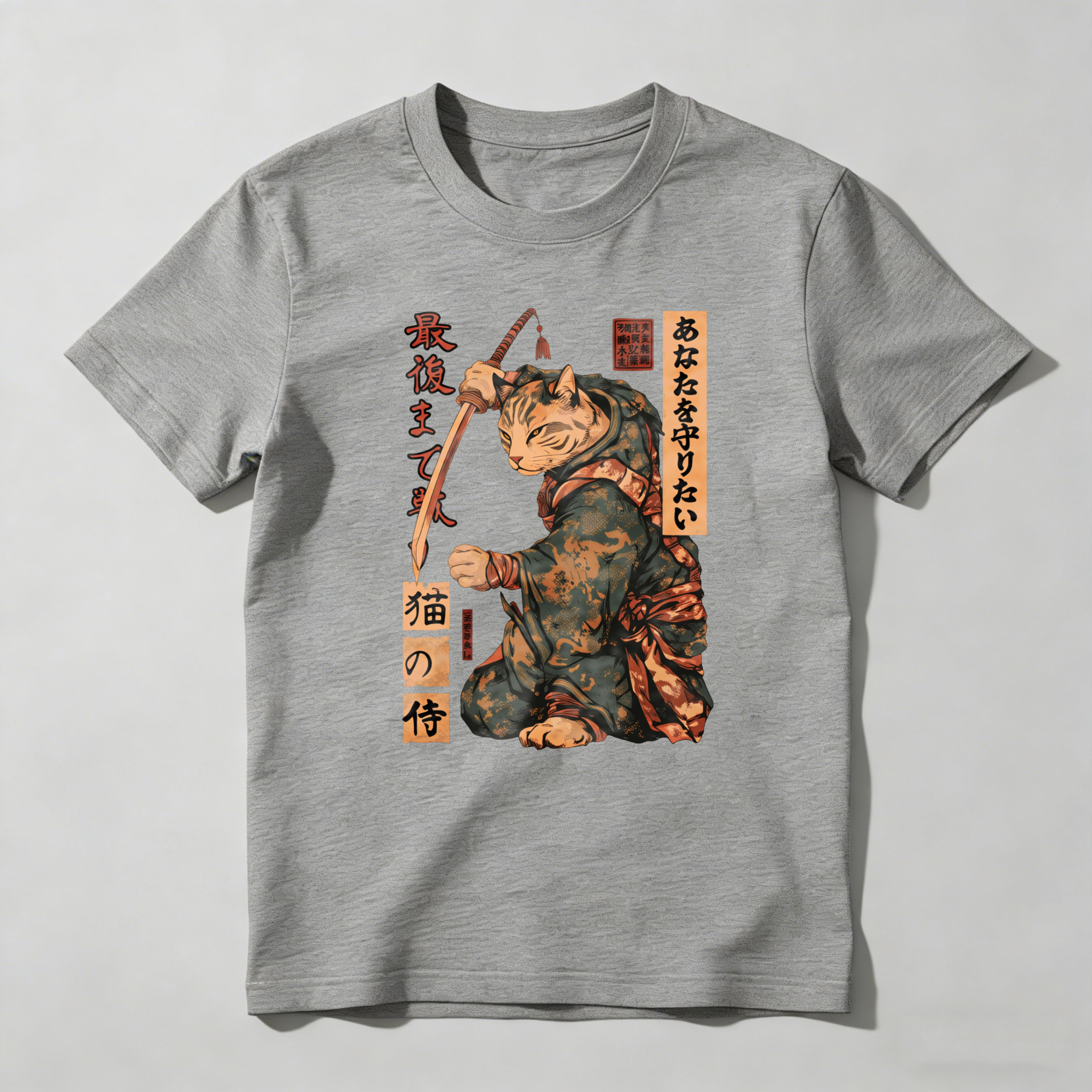 Cat Samurai Warrior Holding Sword With Japanese Text tshirt 100% cotton