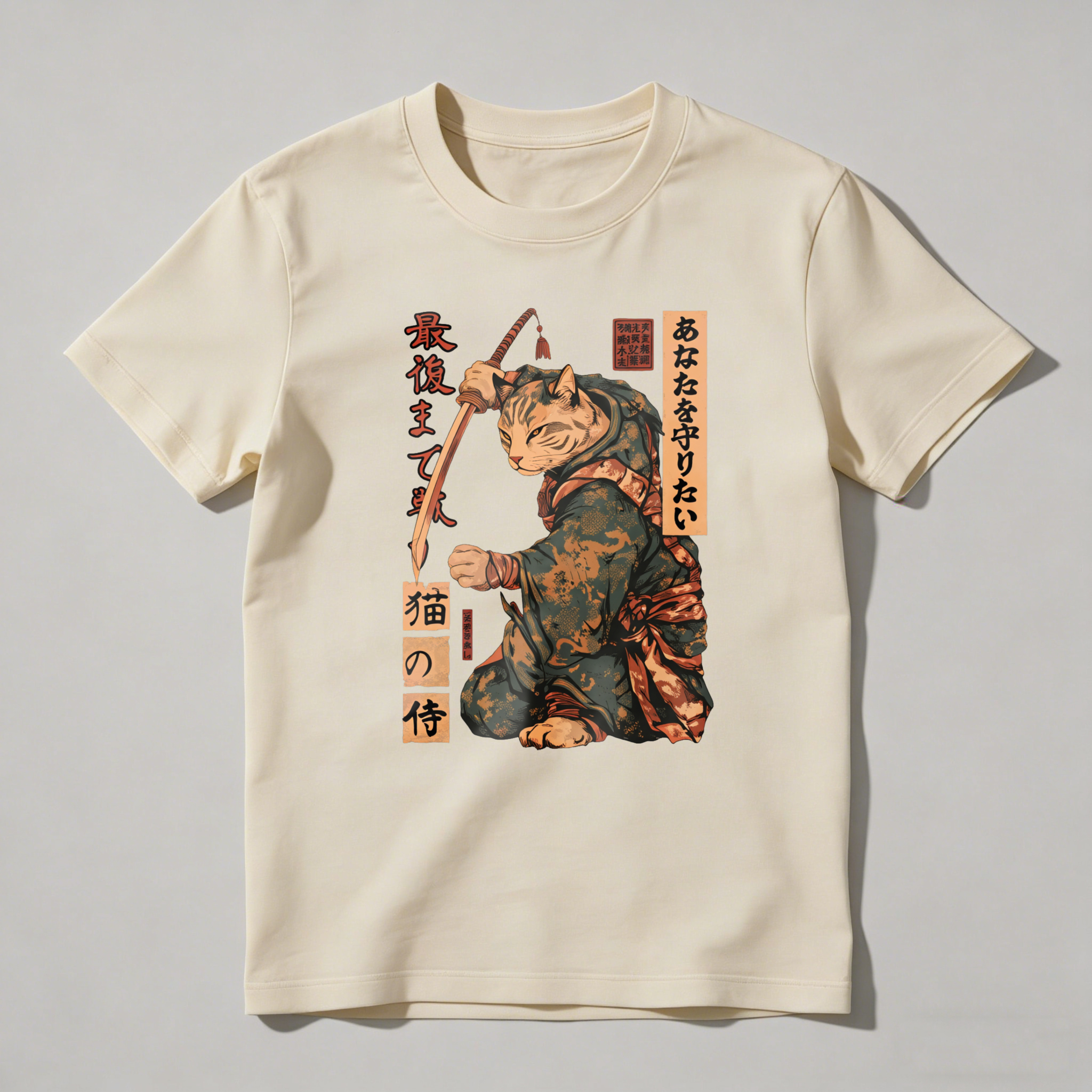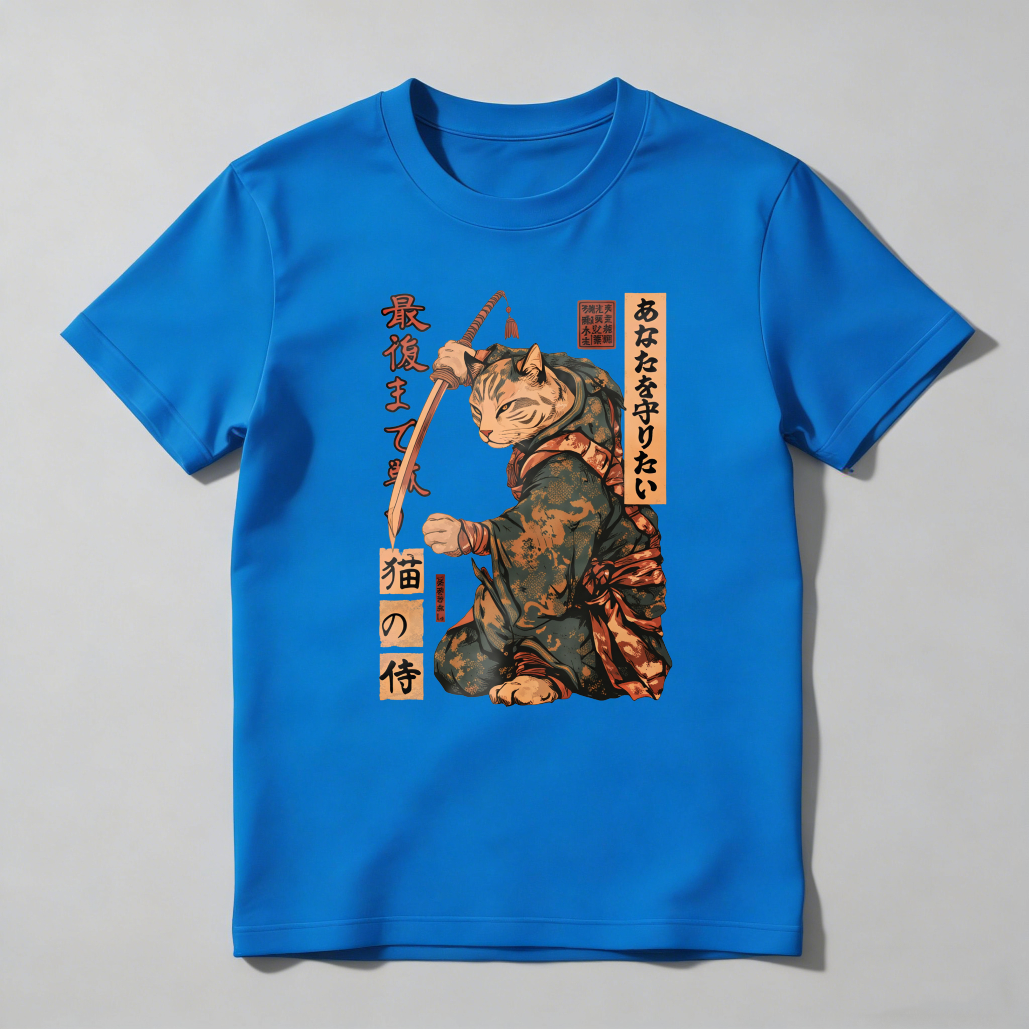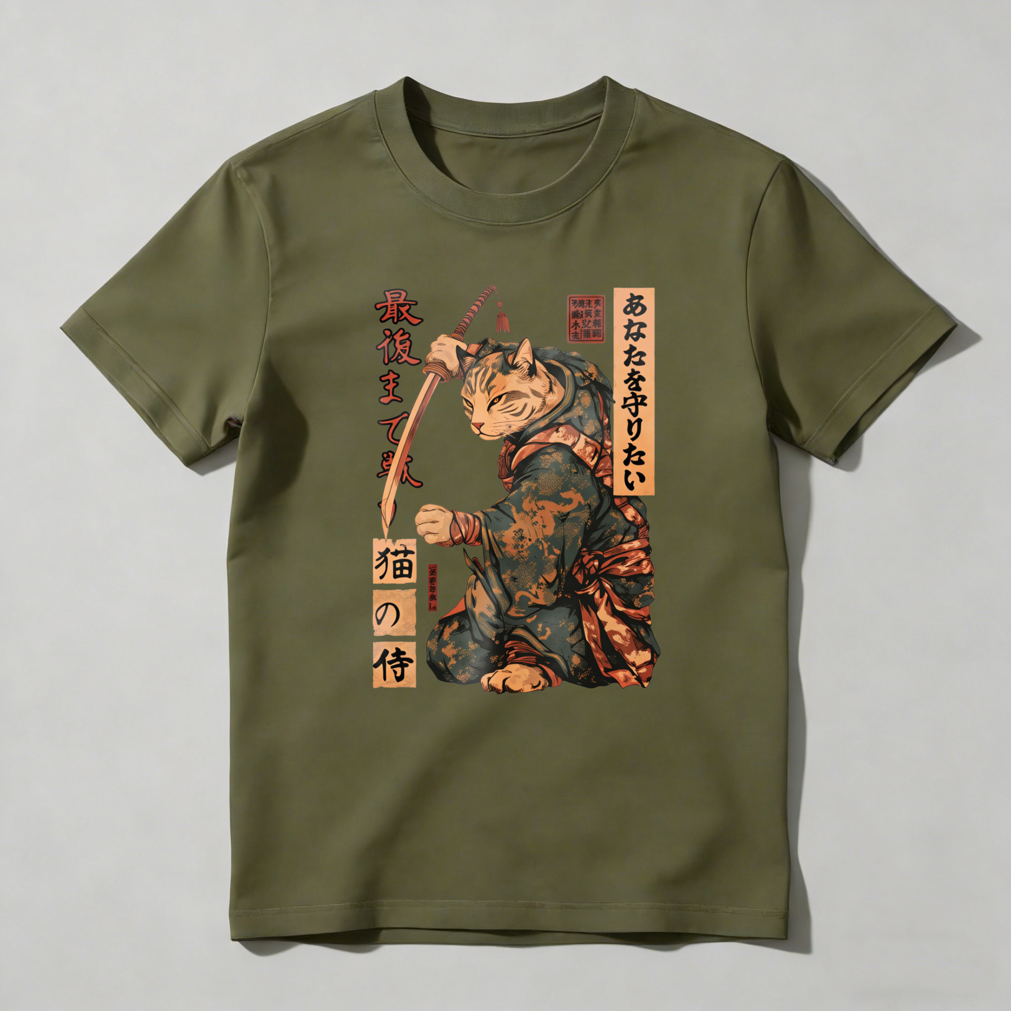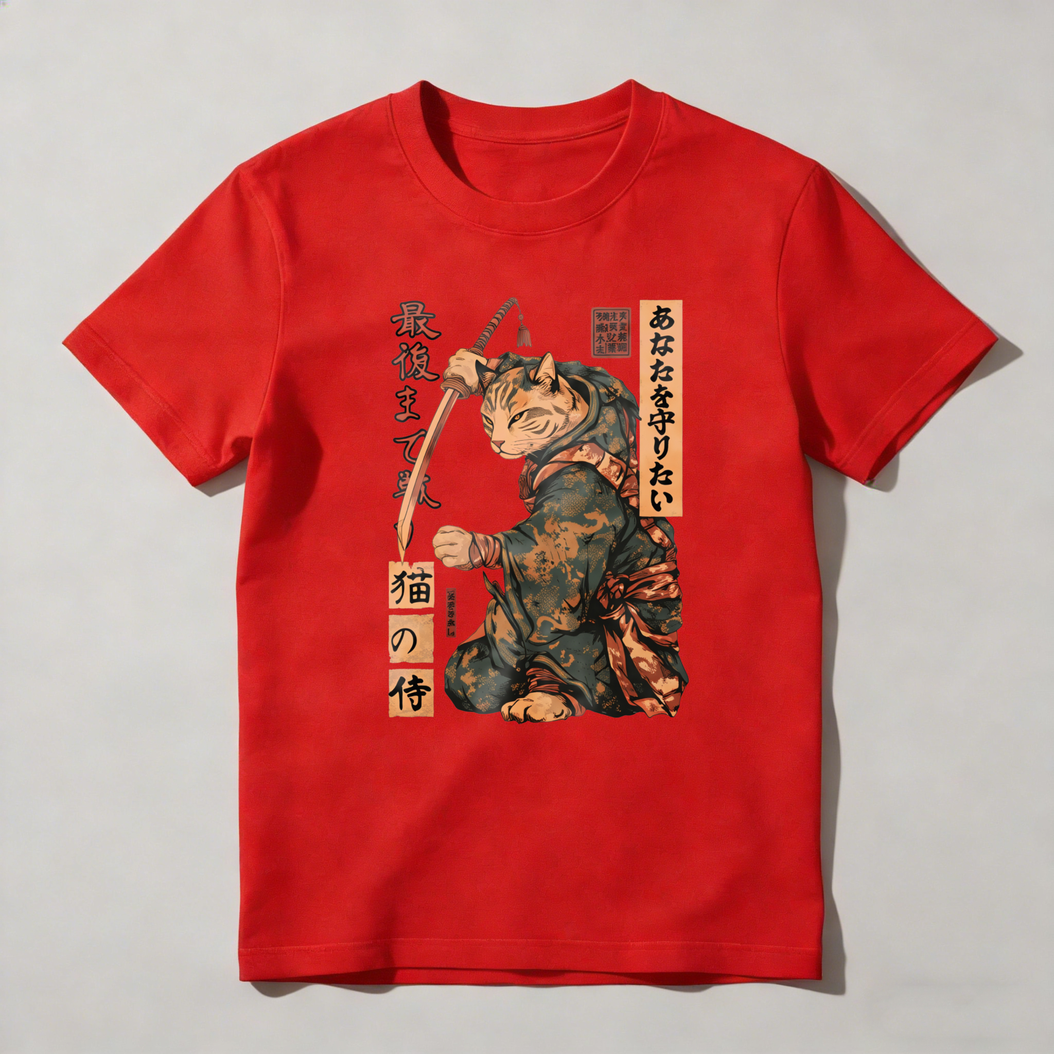 Cat Samurai Warrior Holding Sword With Japanese Text tshirt 100% cotton