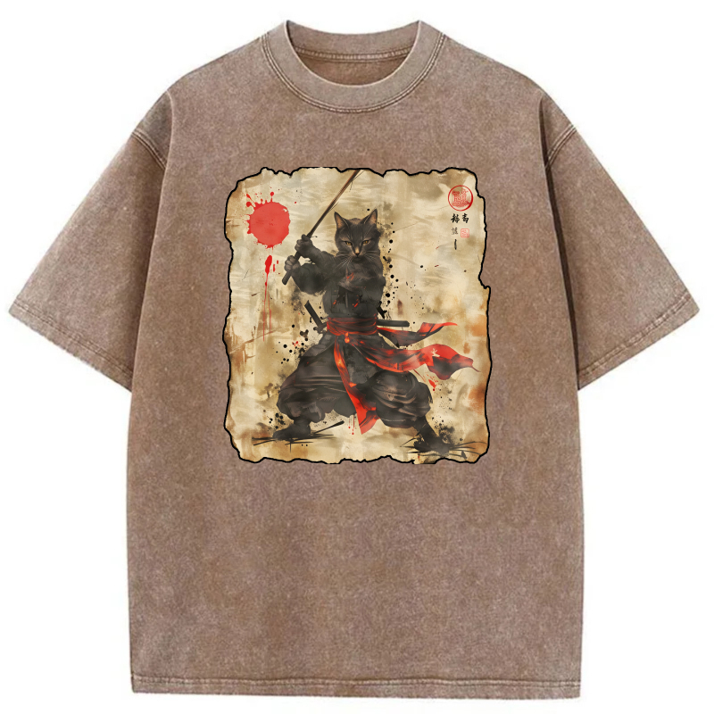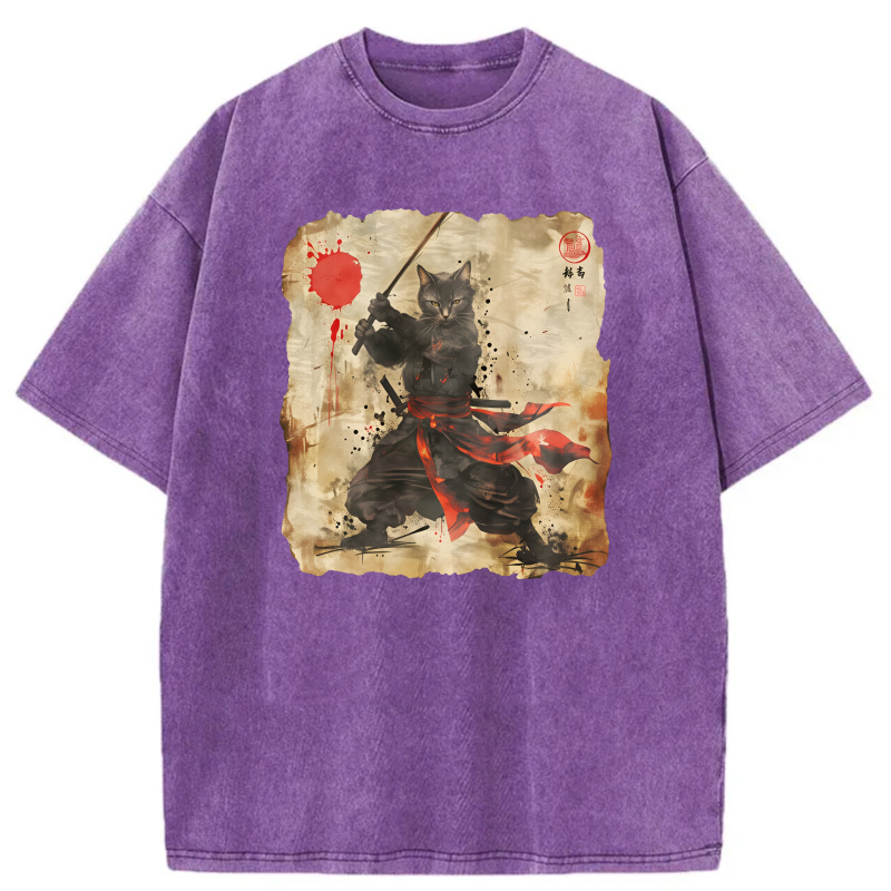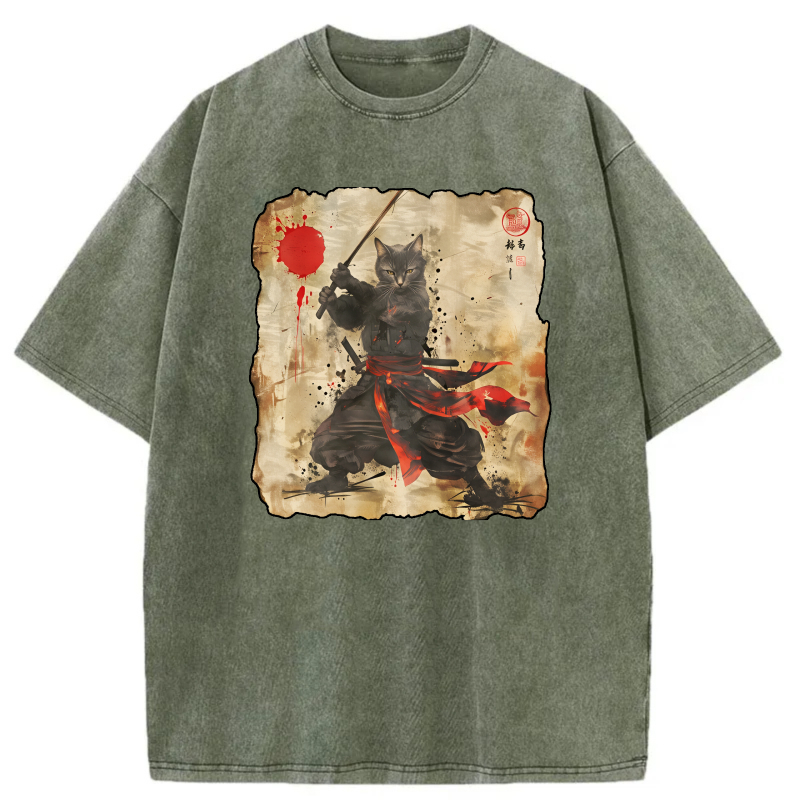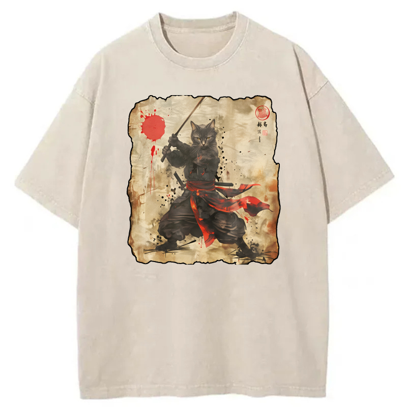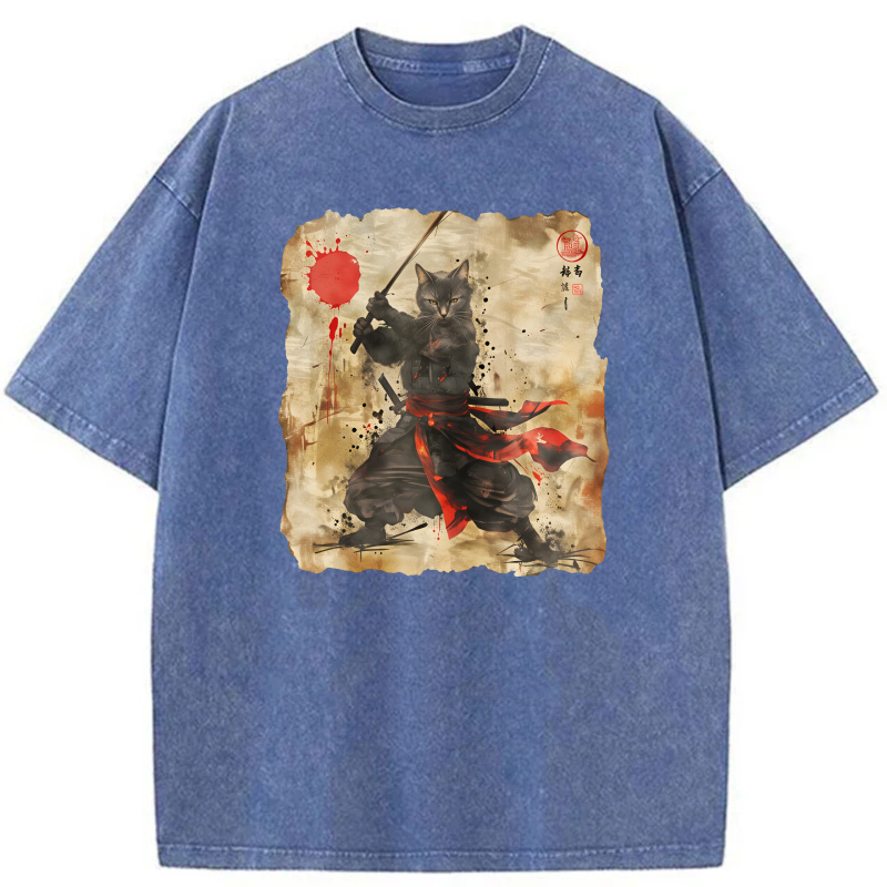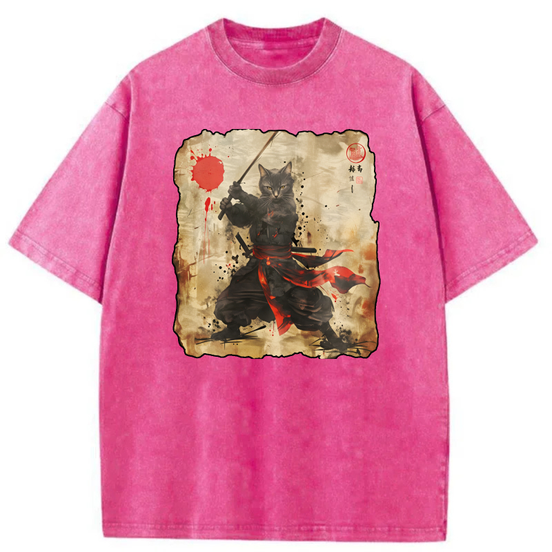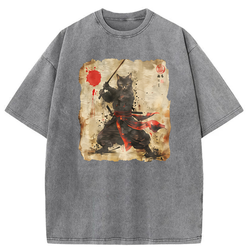 Cat Samurai With Sword And Red Scarf tshirt 100% cotton