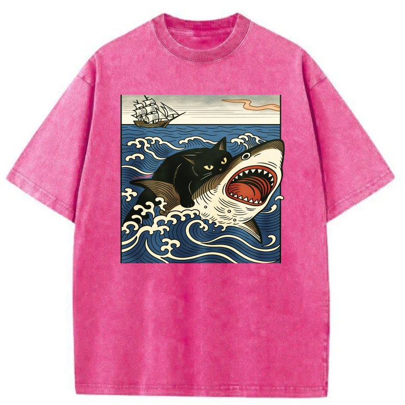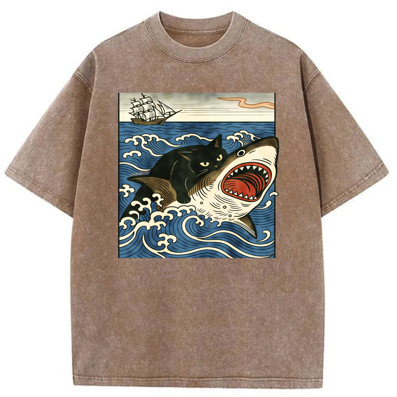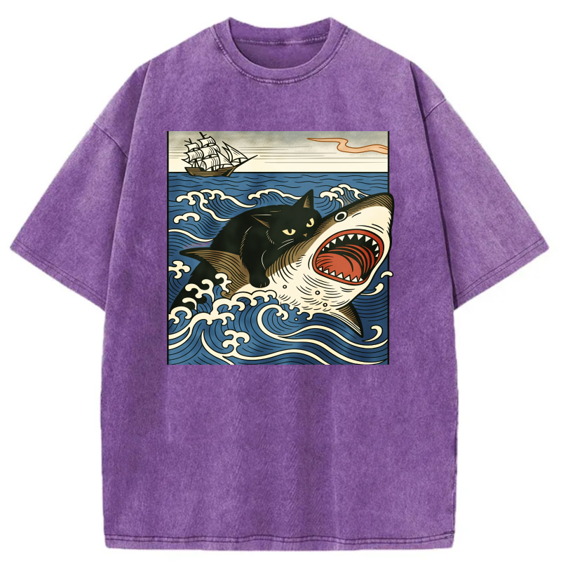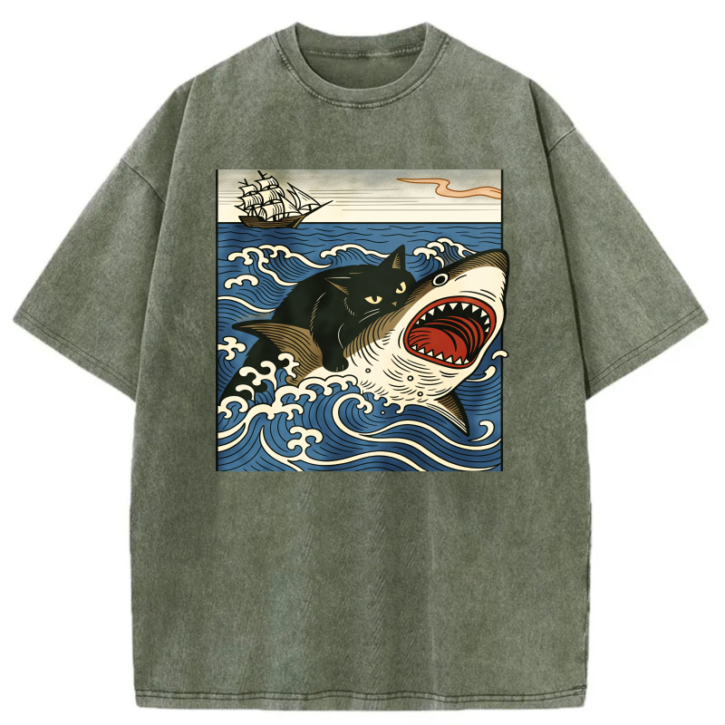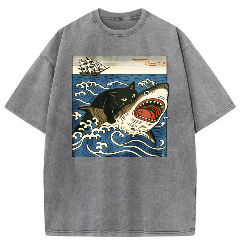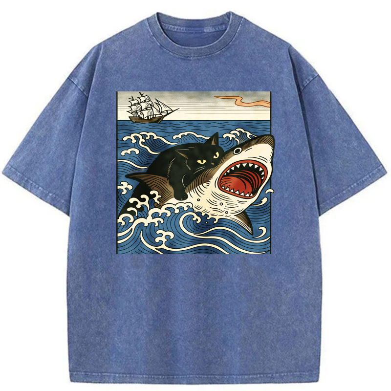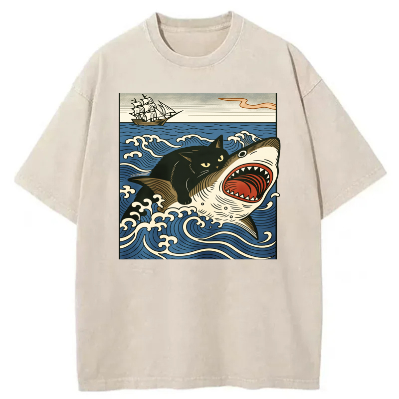 Cat Shark Waves Ship Sky Ocean Art Print tshirt 100% cotton