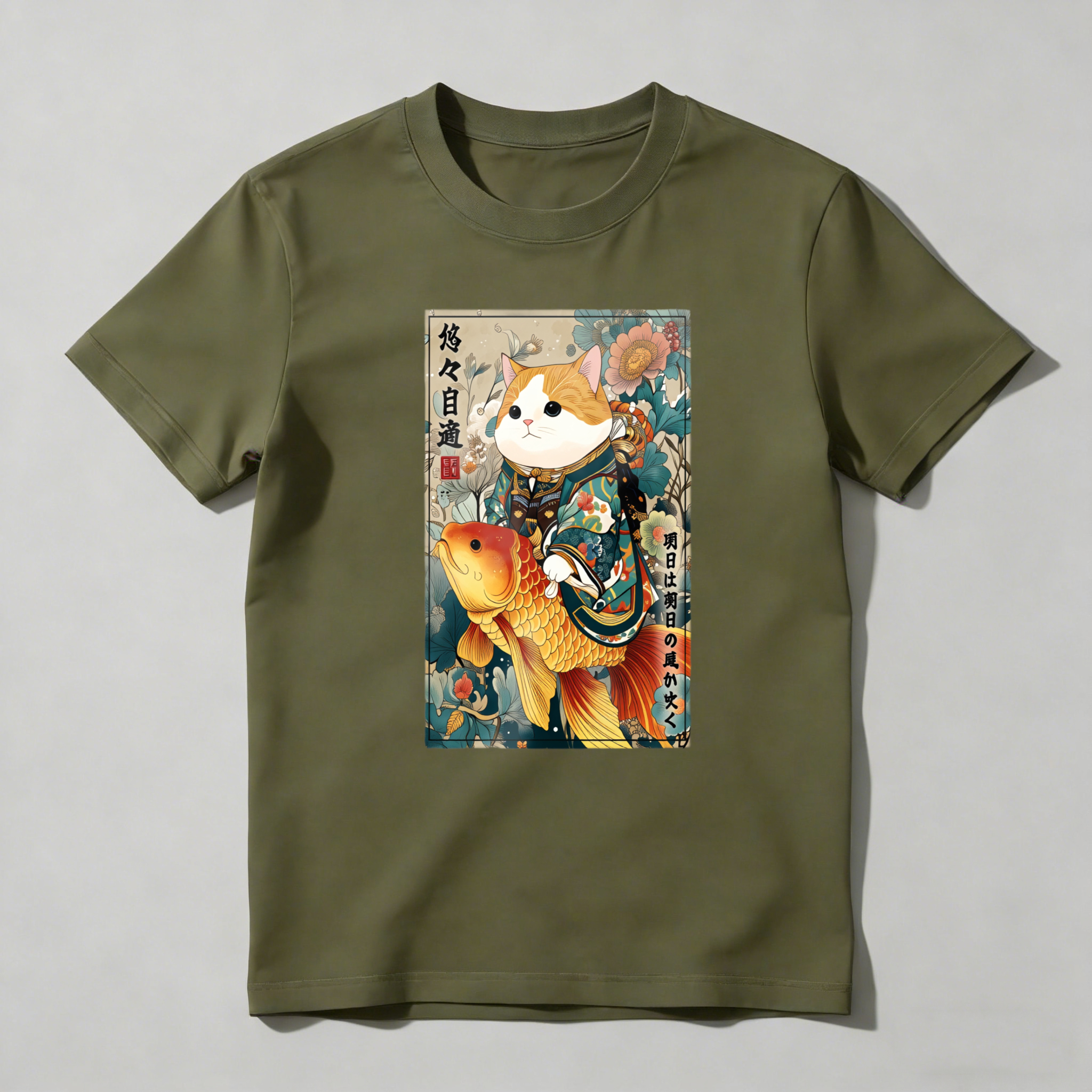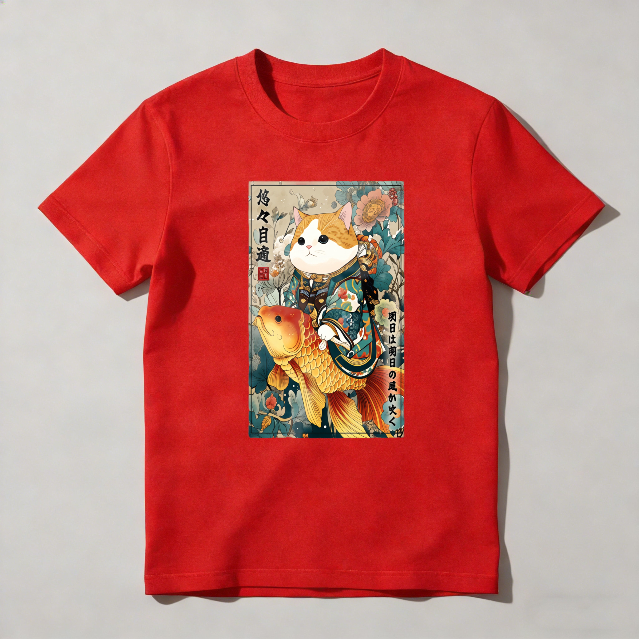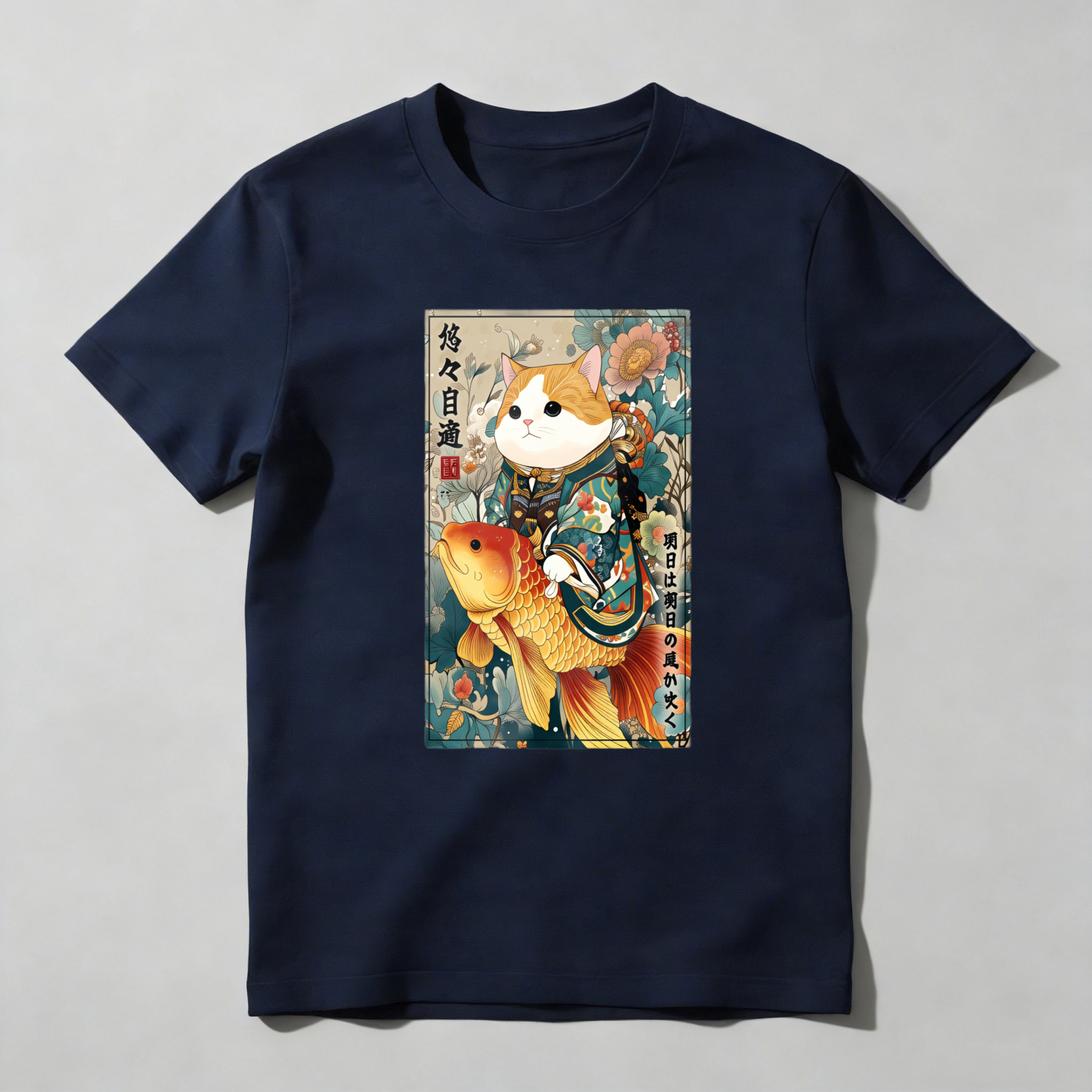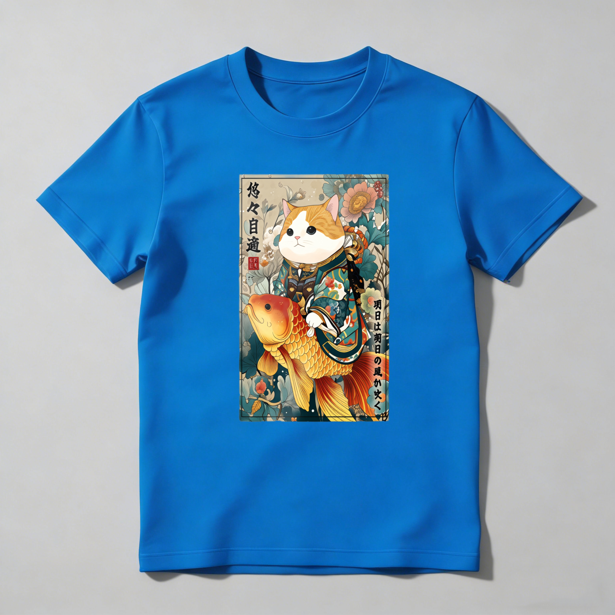 Cat With Koi Fish And Flowers tshirt 100% cotton