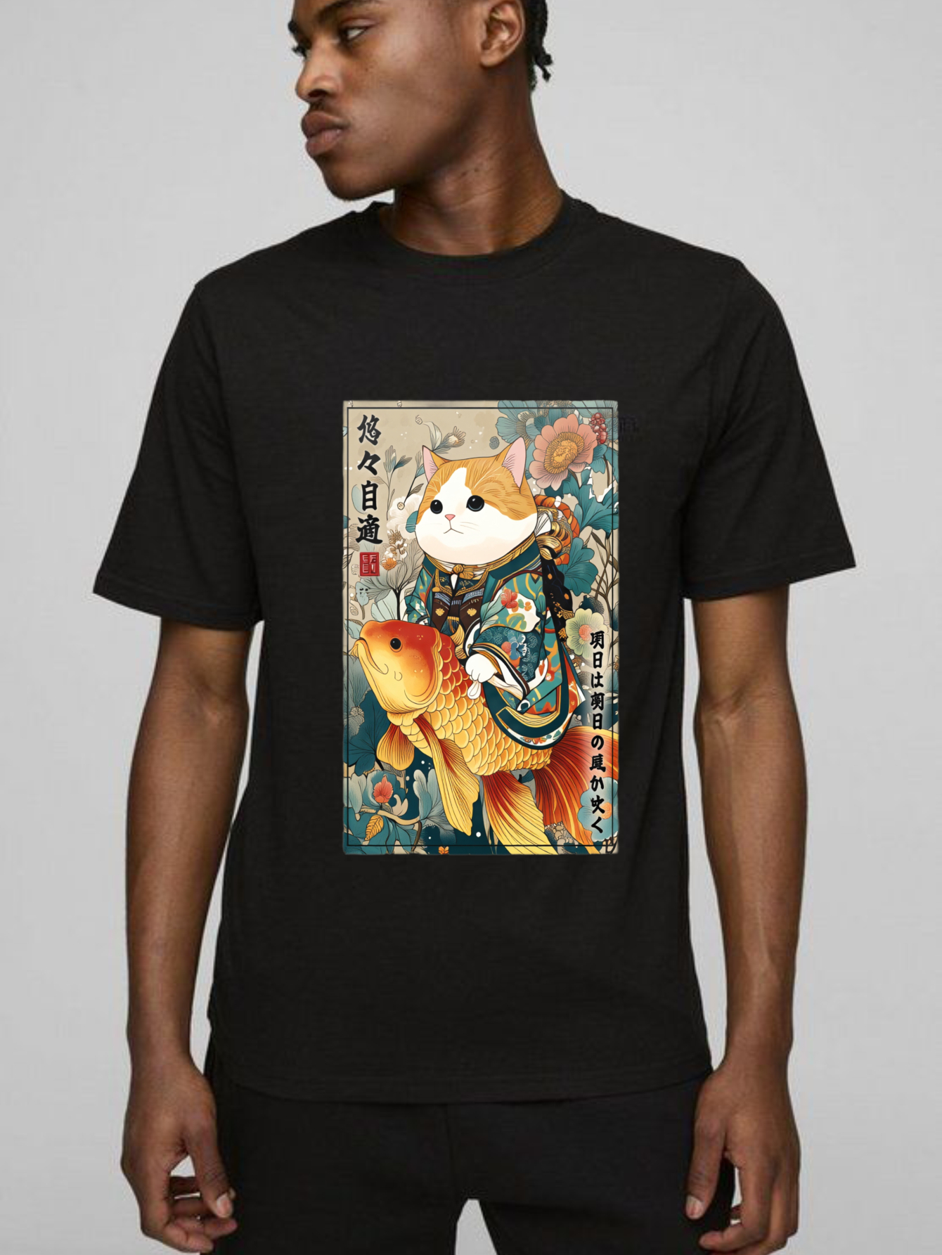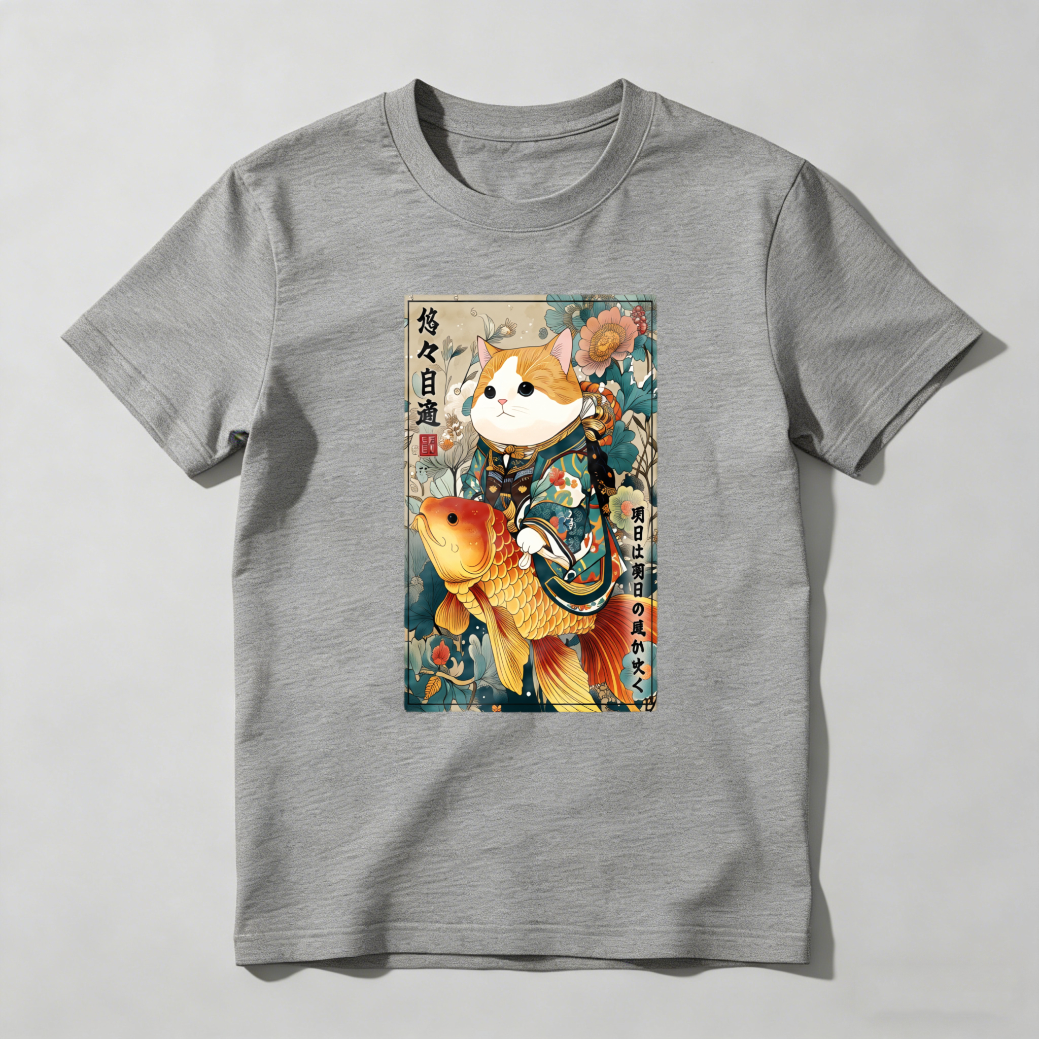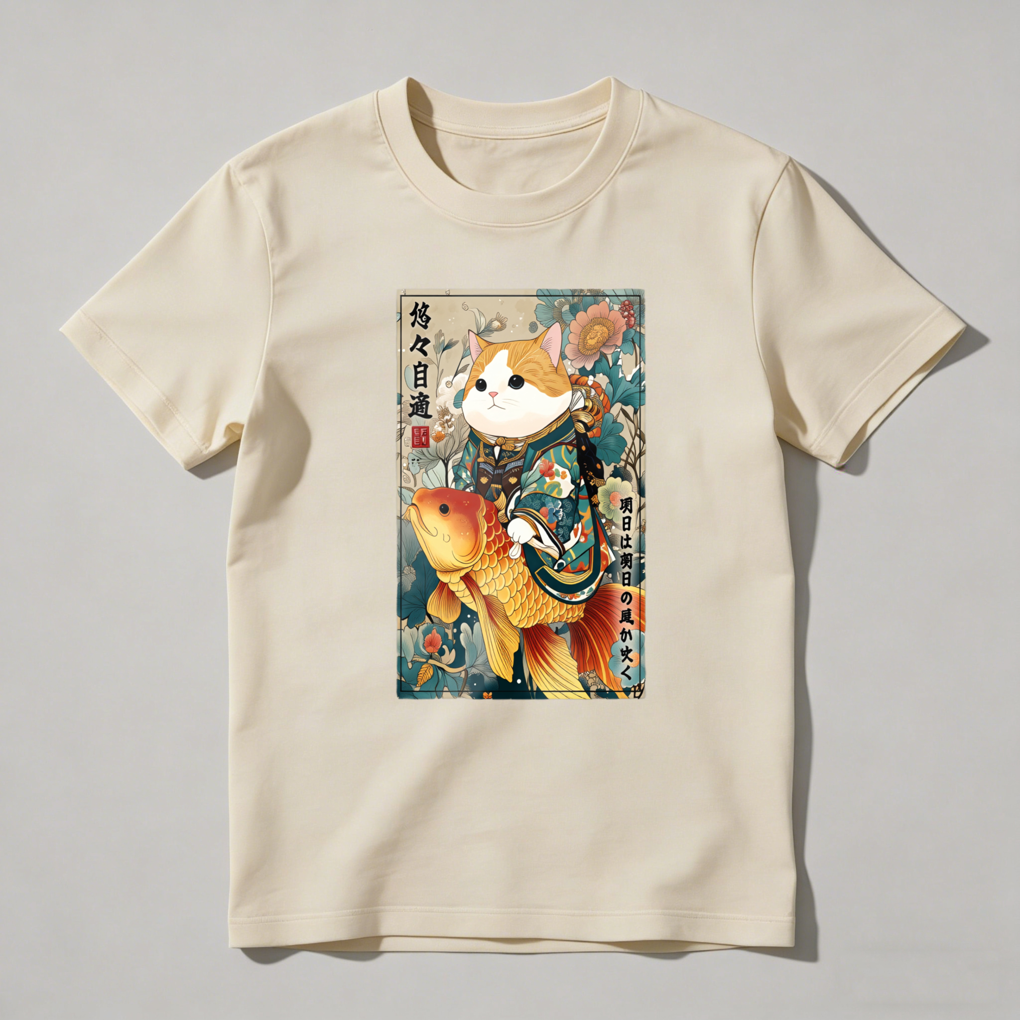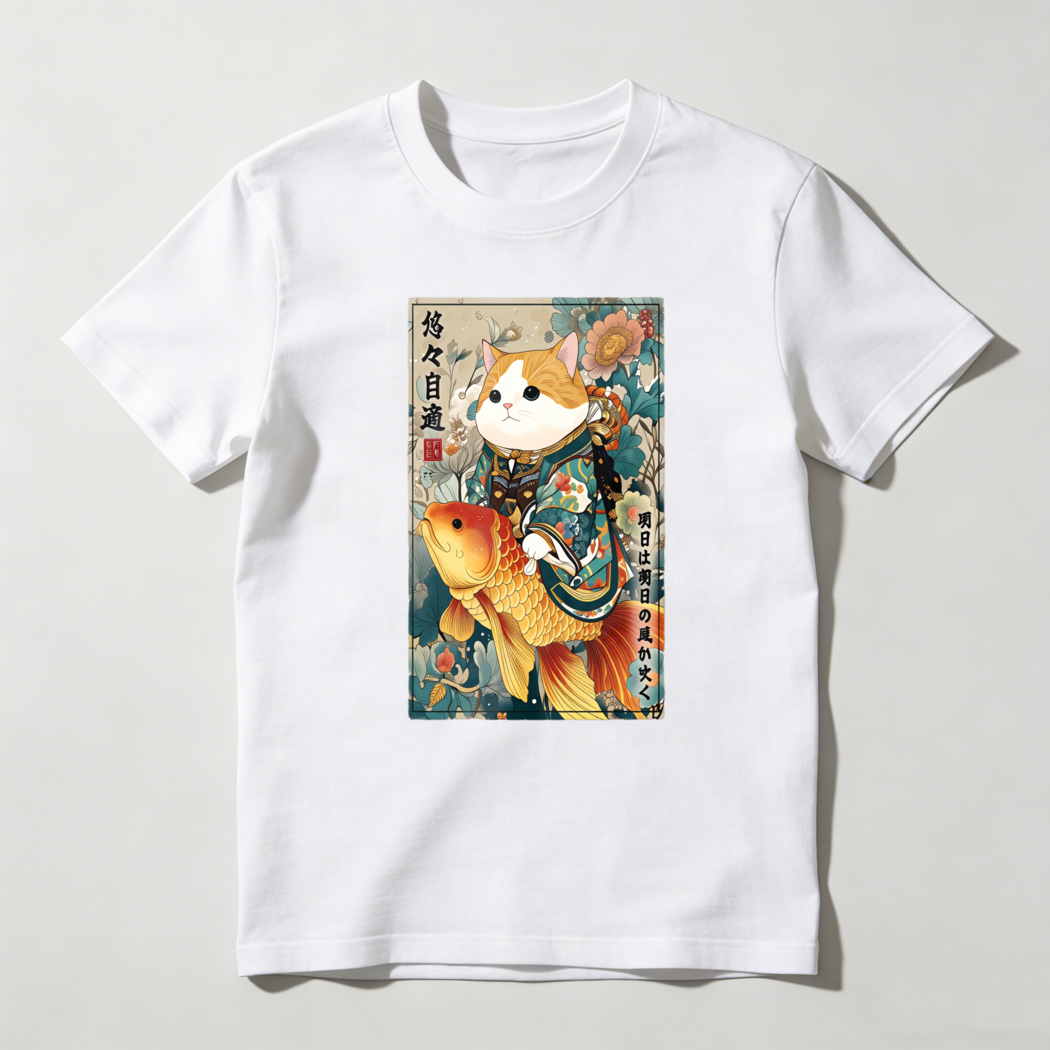 Cat With Koi Fish And Flowers tshirt 100% cotton