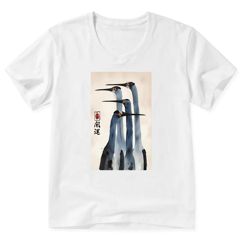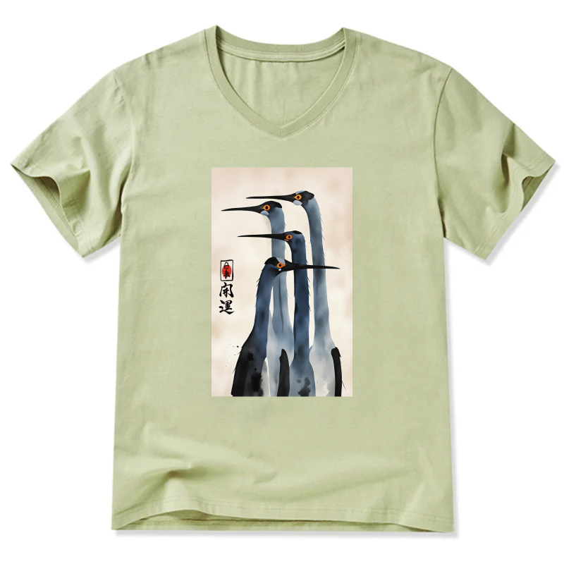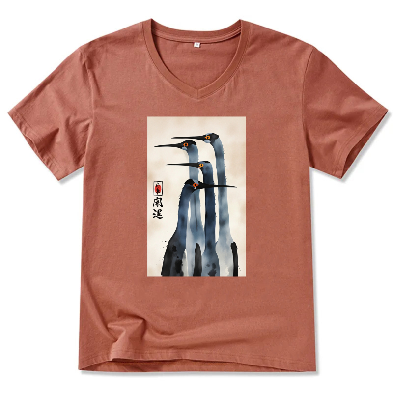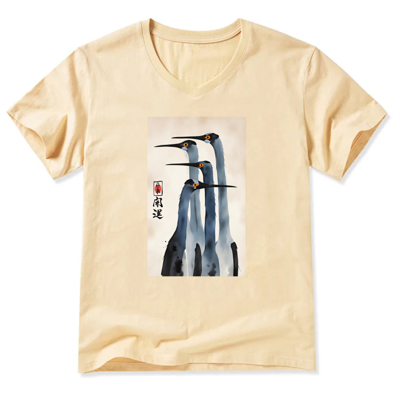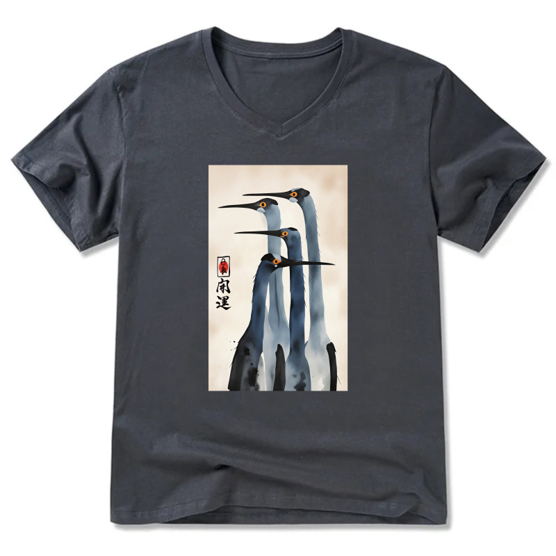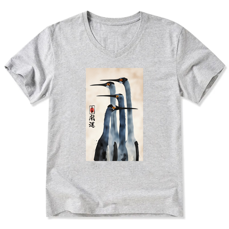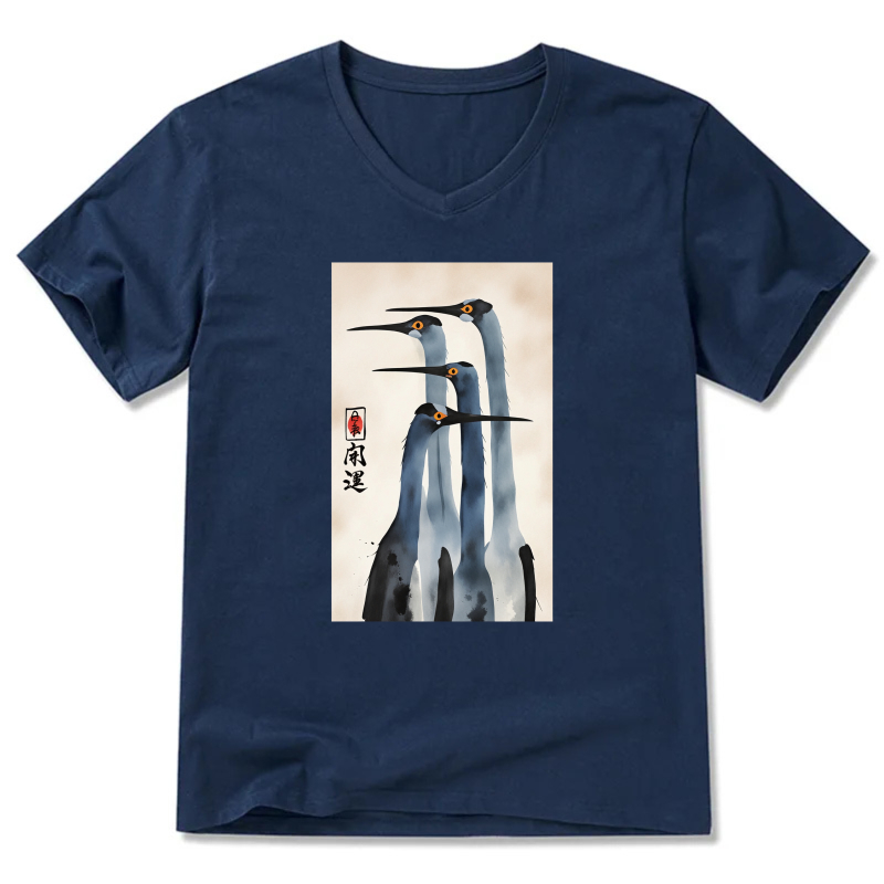 Japanese Crane Art Print T Shirt Men Women Black V Neck Casual Top