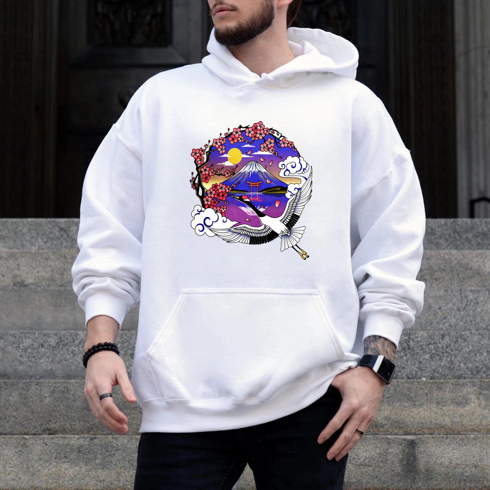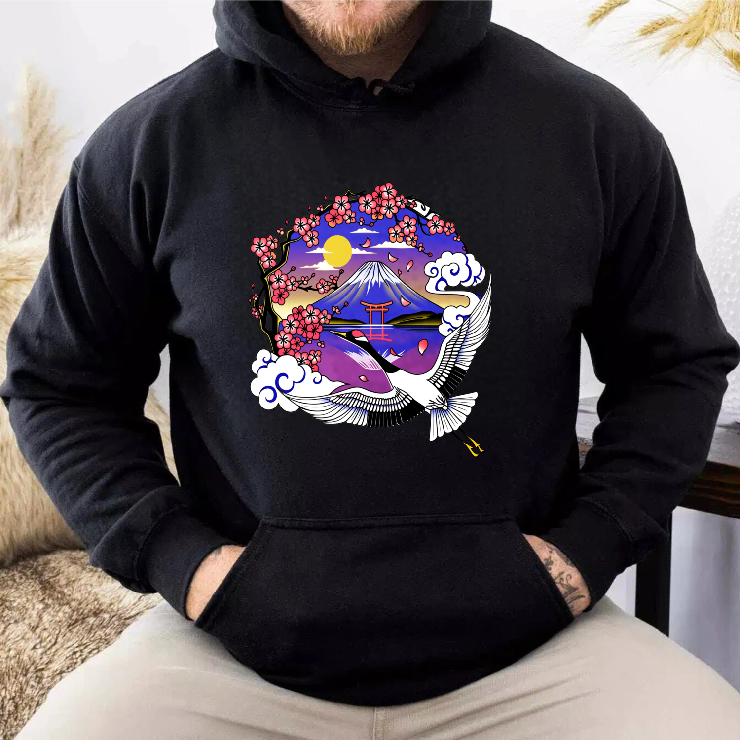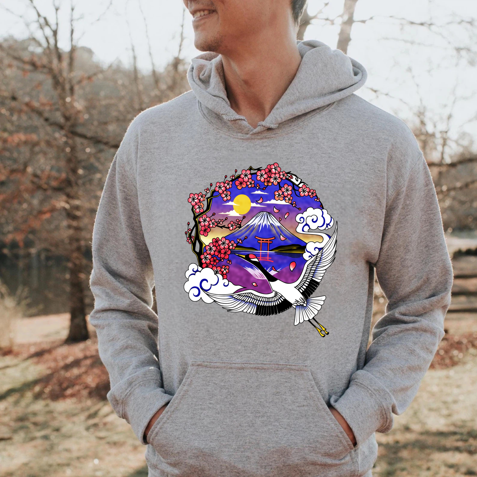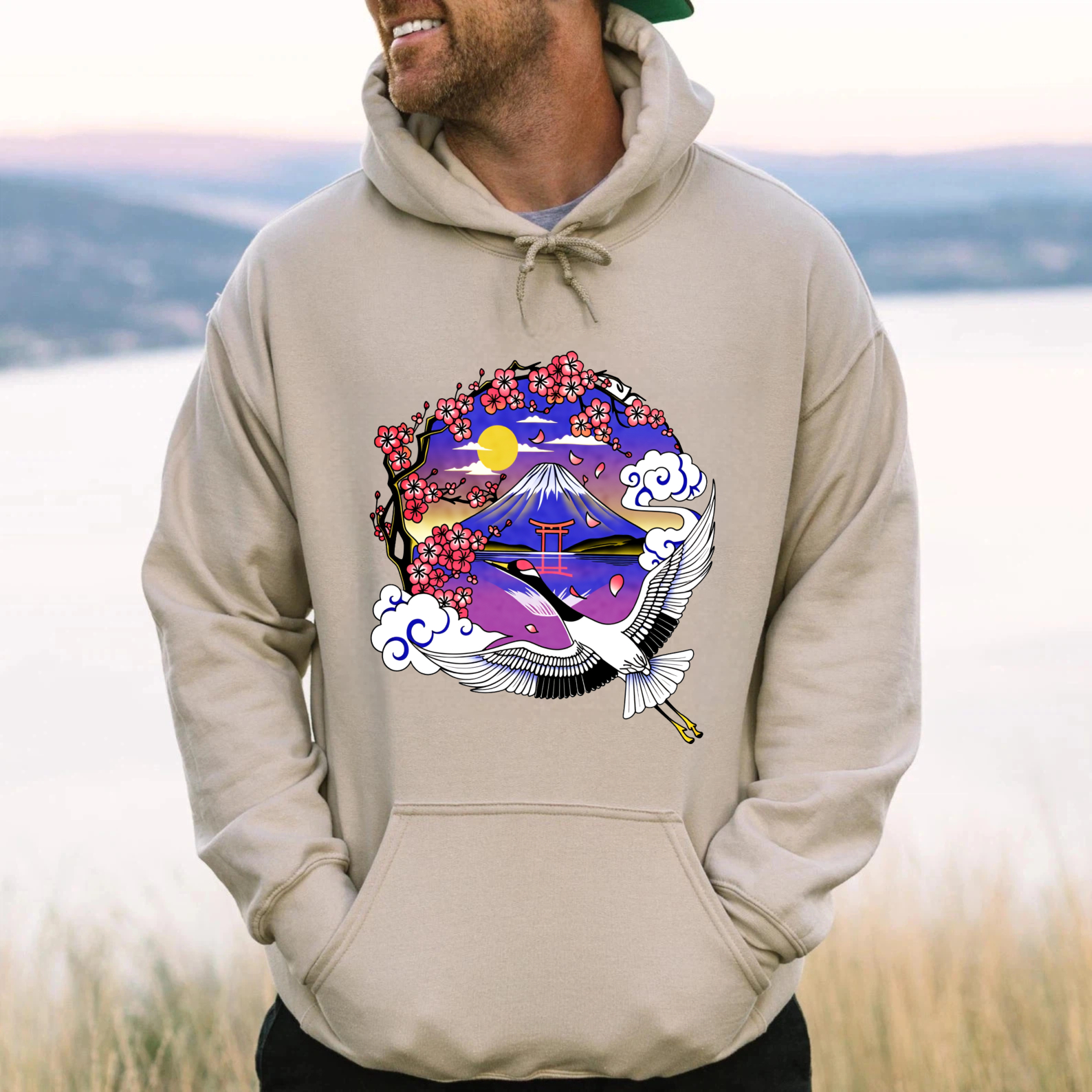 Japanese Mountain Landscape Hoodie With Crane And Cherry Blossoms Art Design