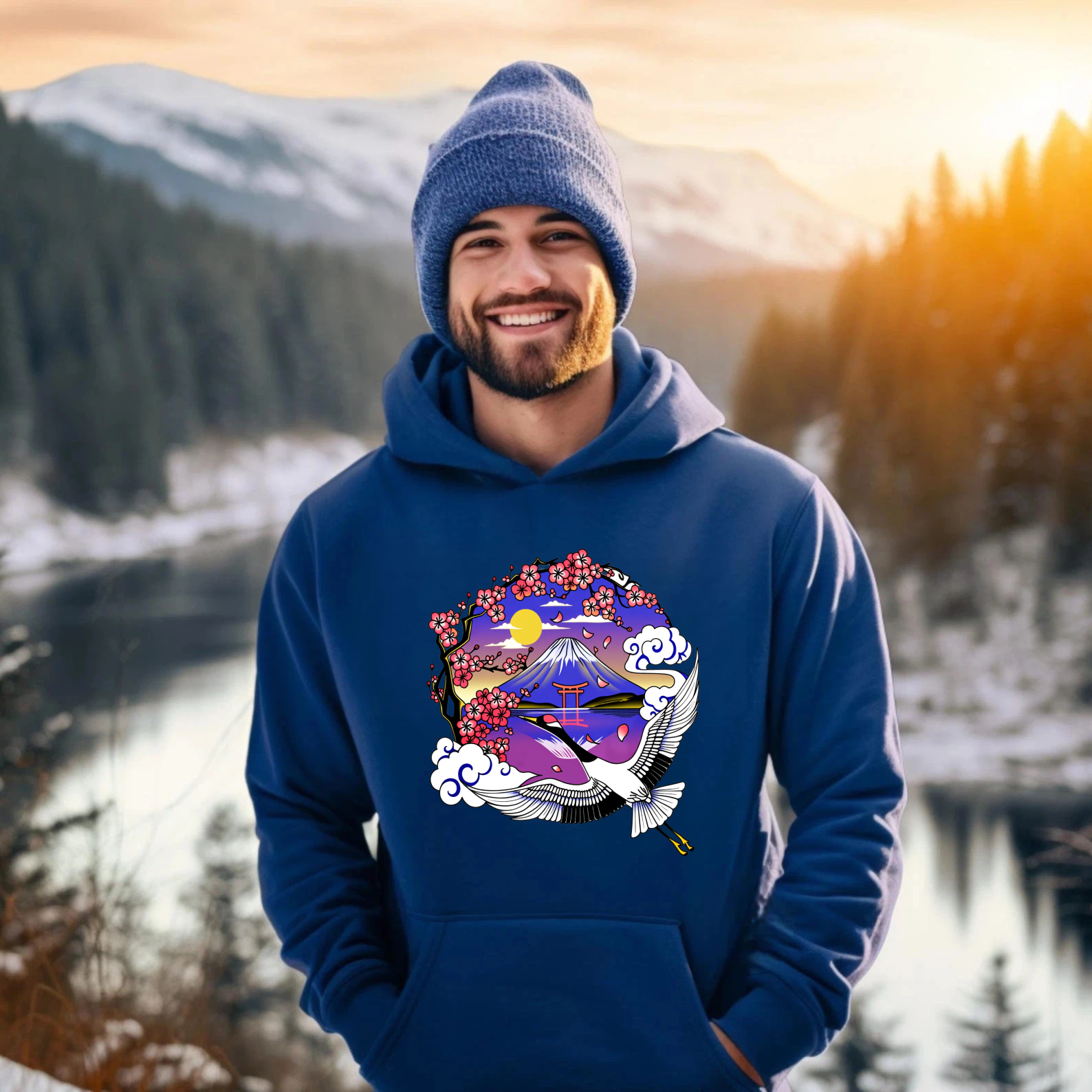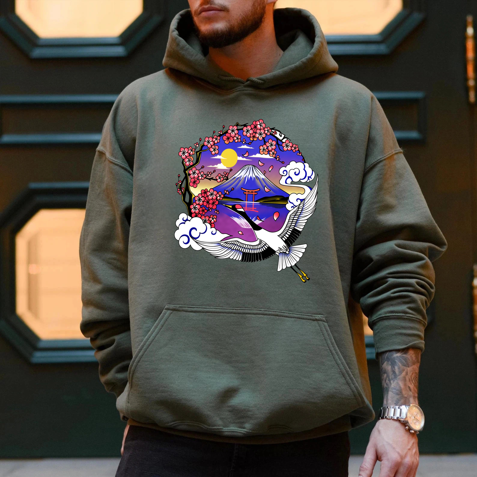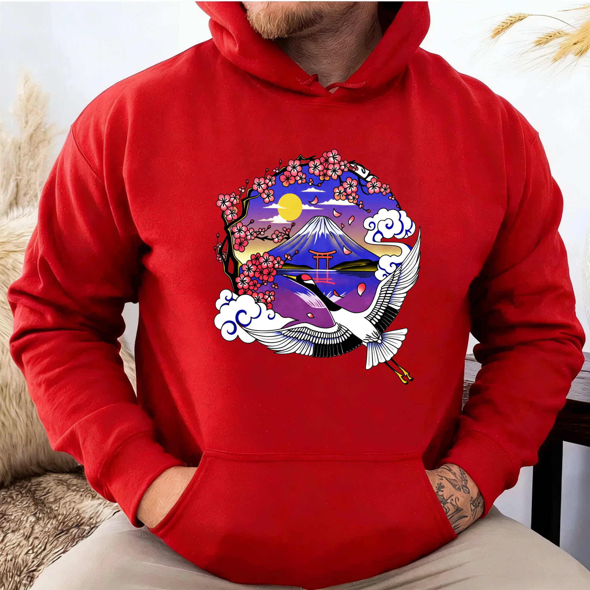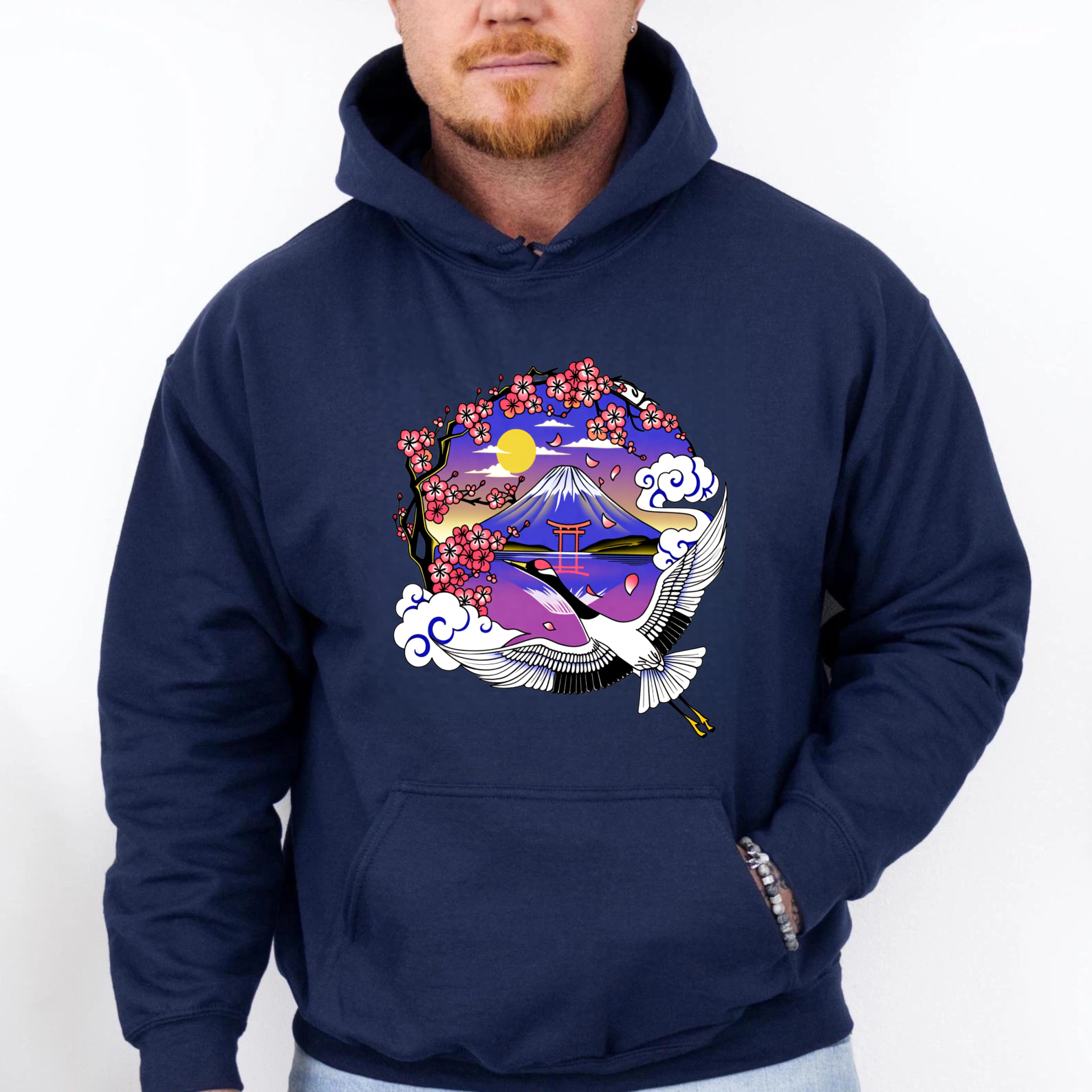 Japanese Mountain Landscape Hoodie With Crane And Cherry Blossoms Art Design