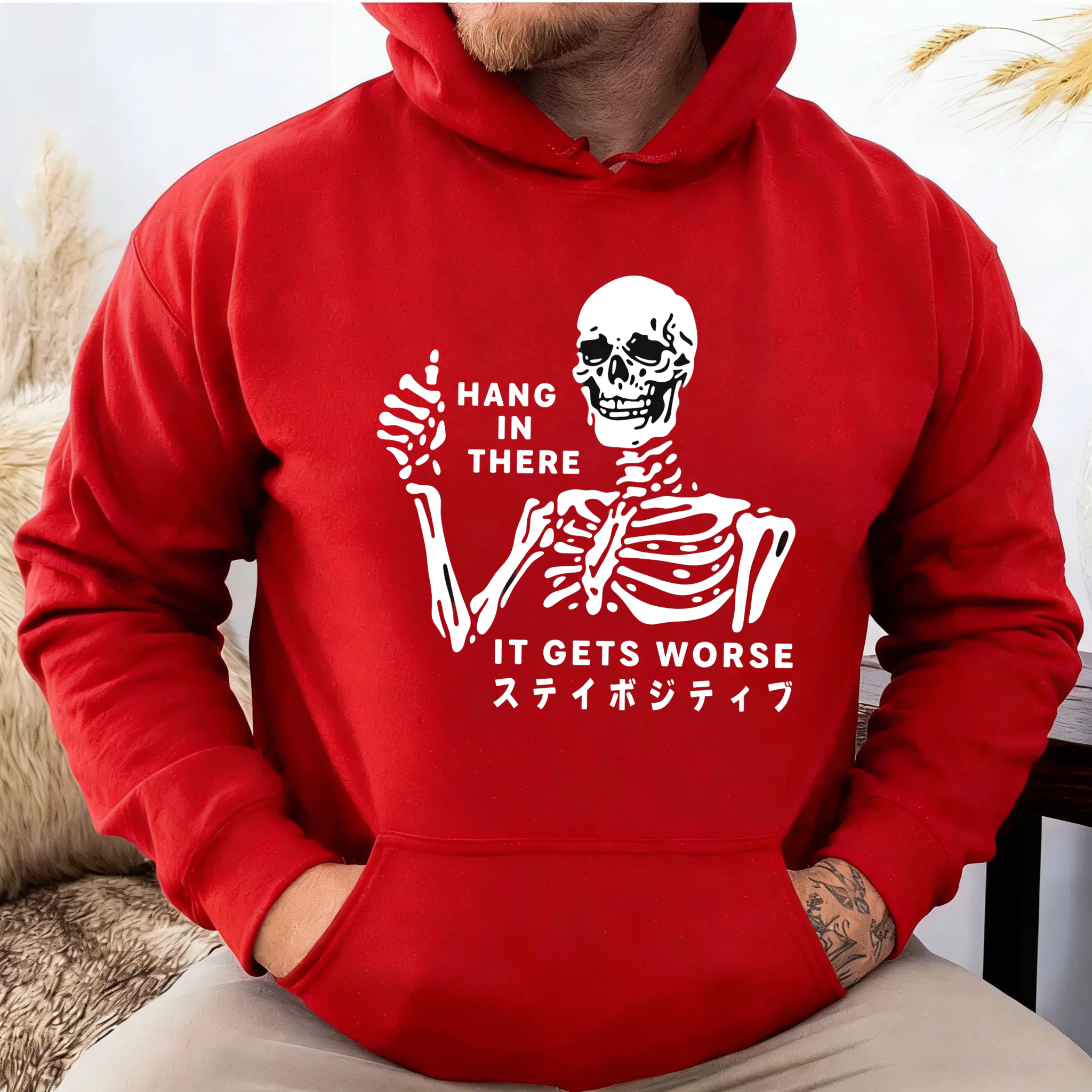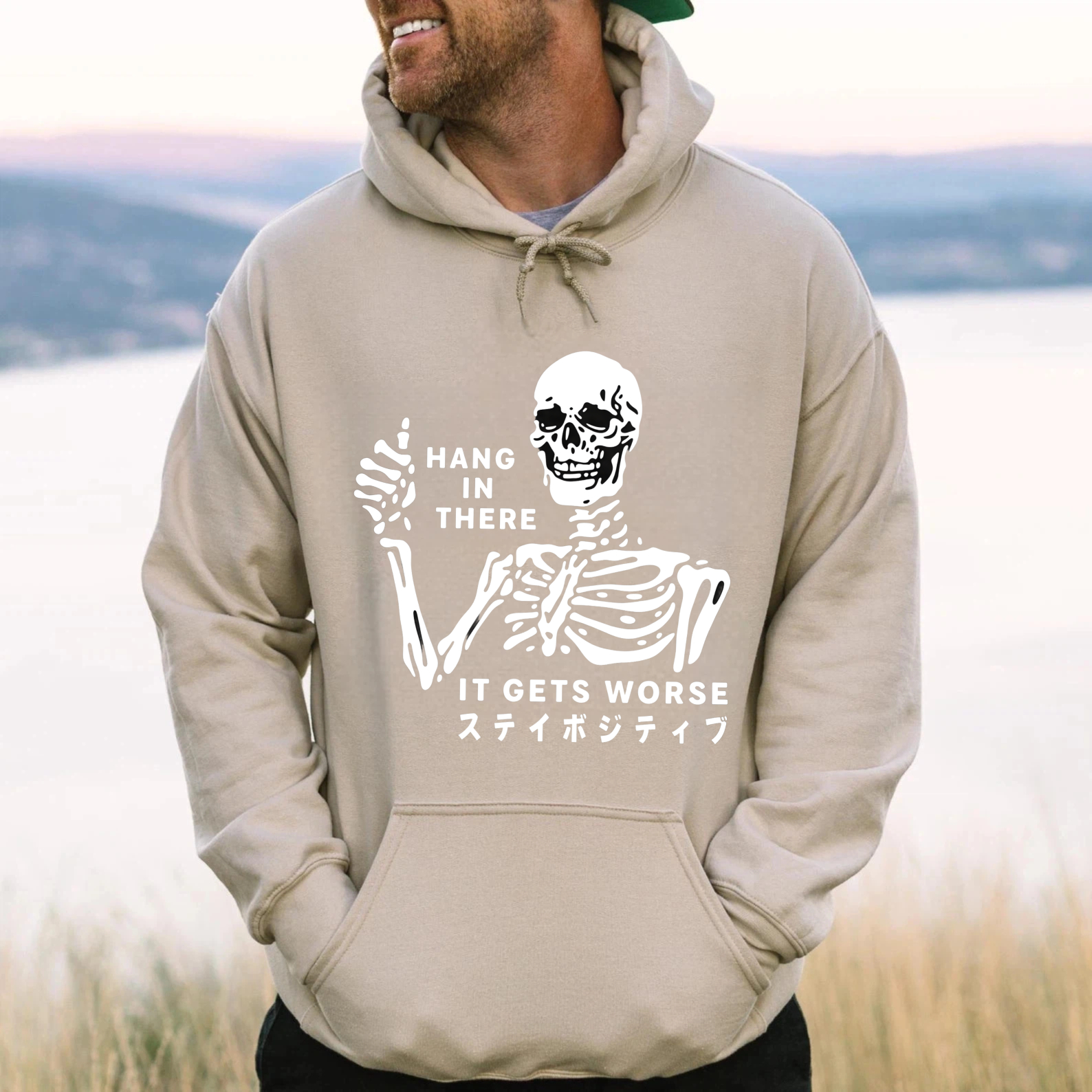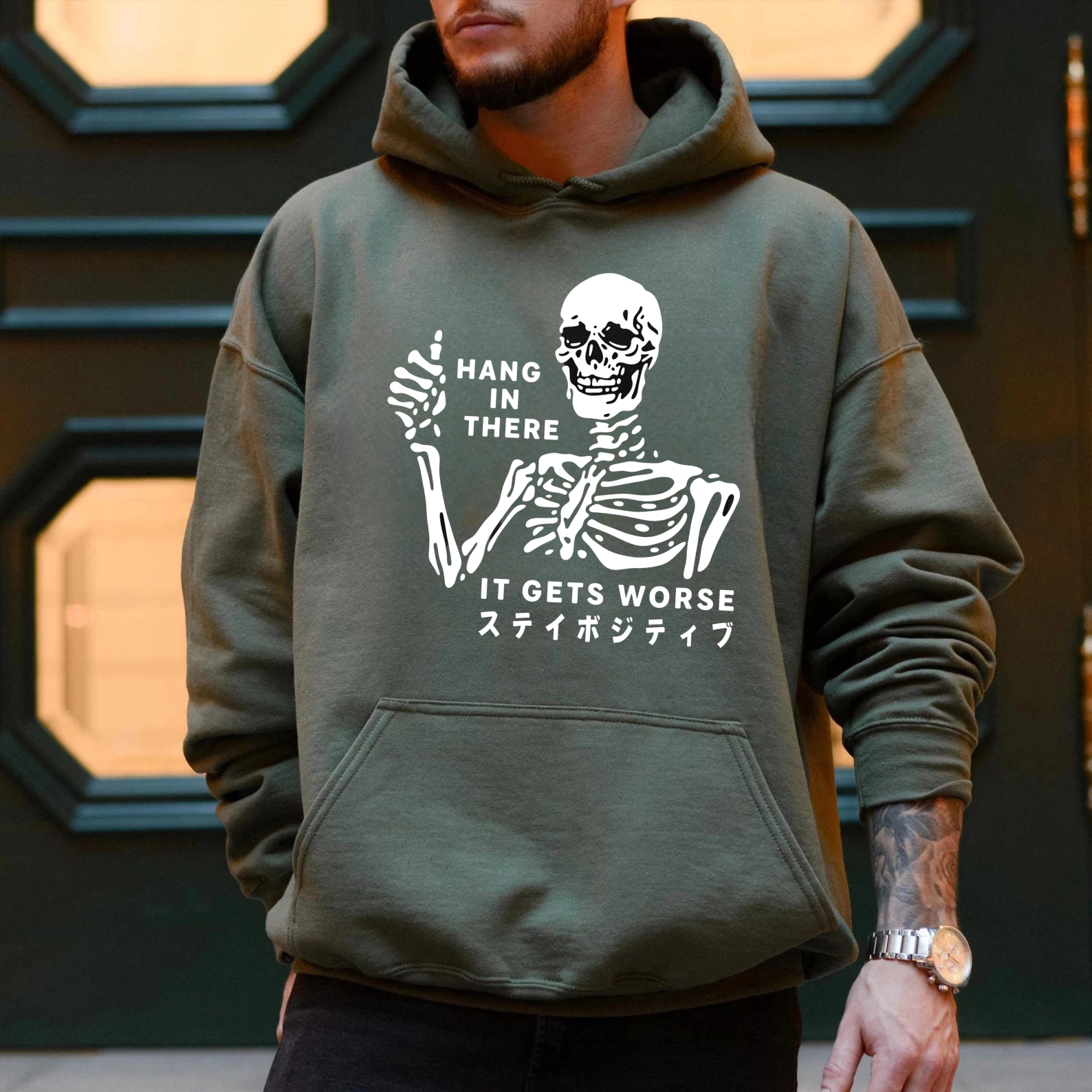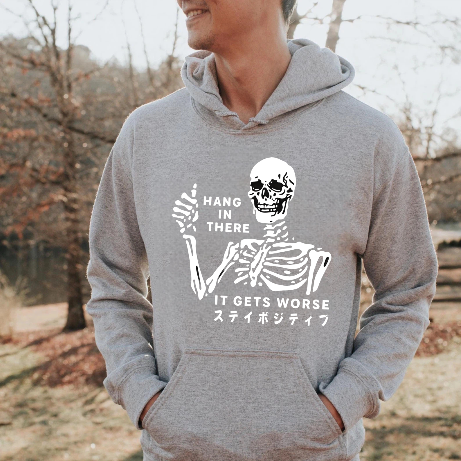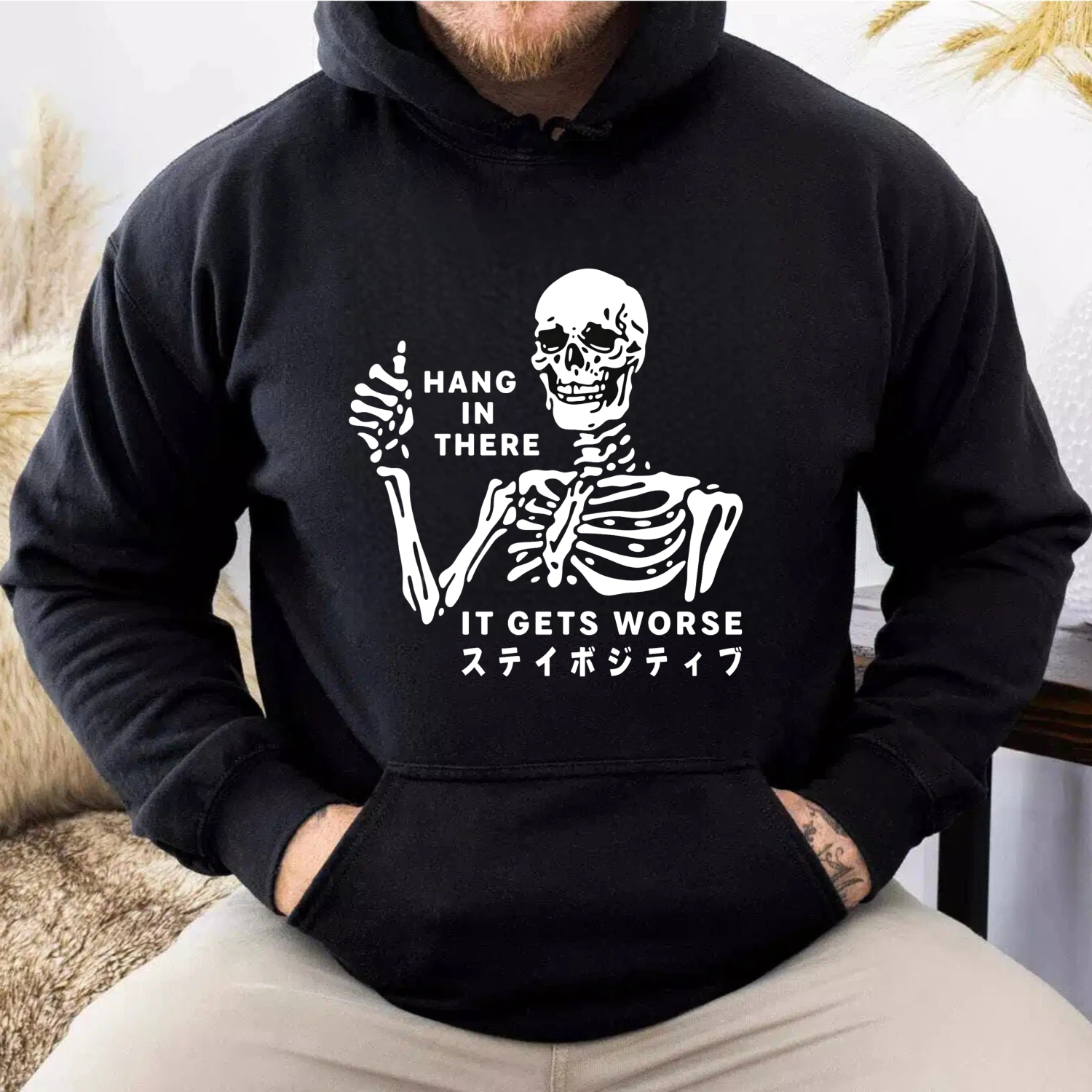 Skeleton Hang In There It Gets Worse Hoodie With Japanese Text Black Sweatshirt For Men Women Unisex Casual Wear