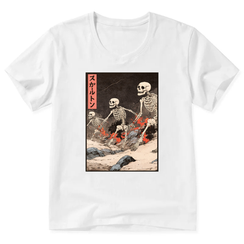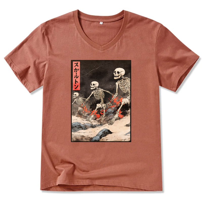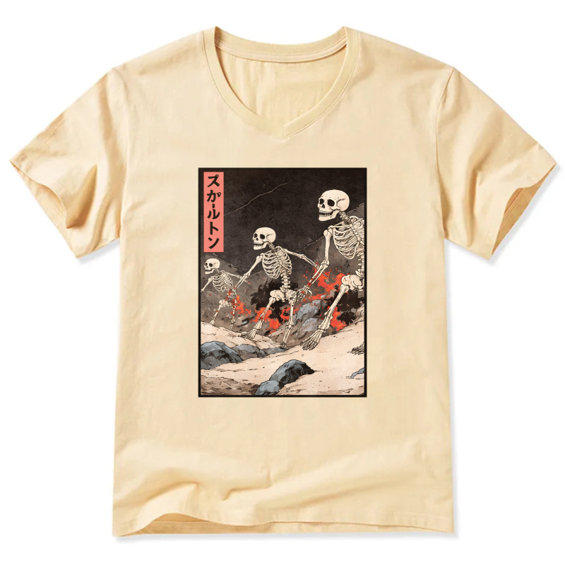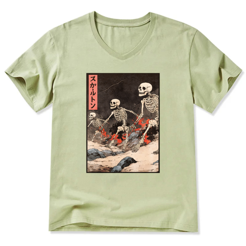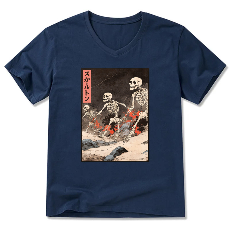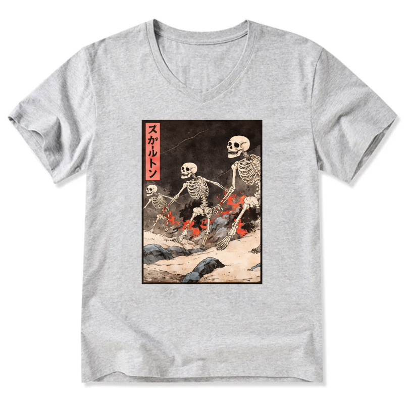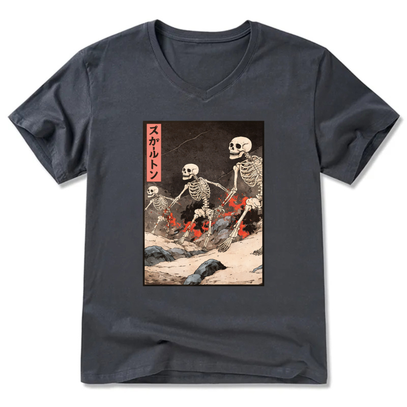 Skeletons In Japanese Style Art T Shirt Black V Neck Design